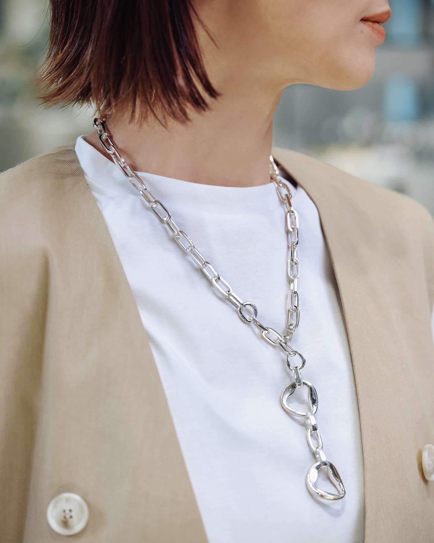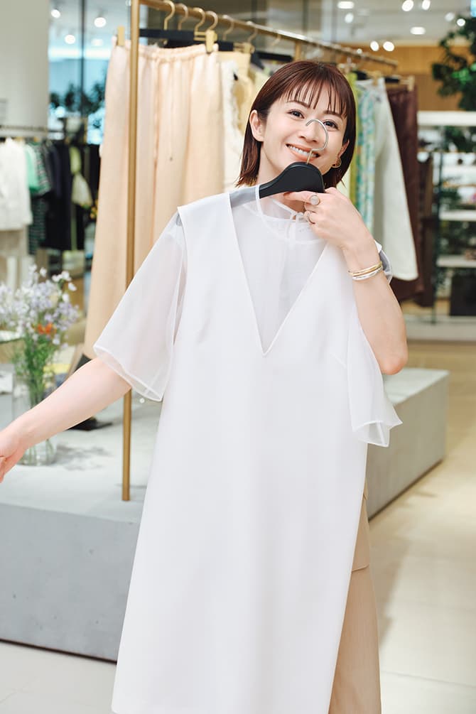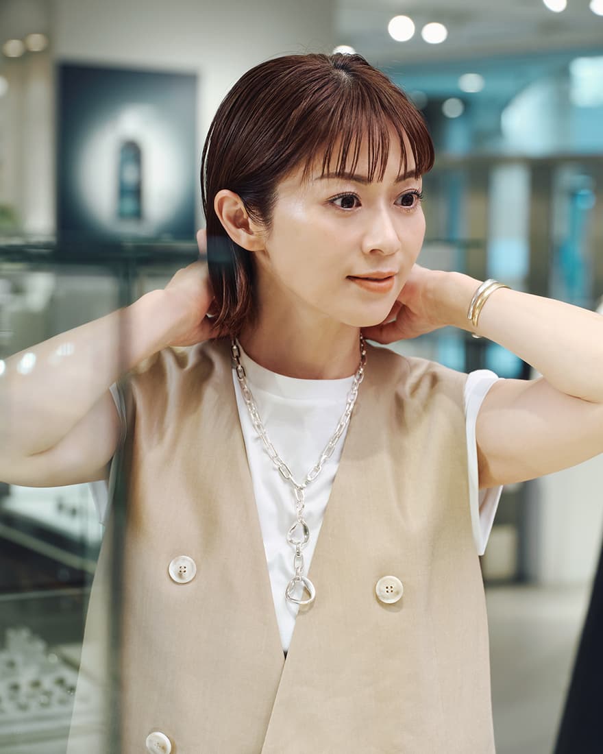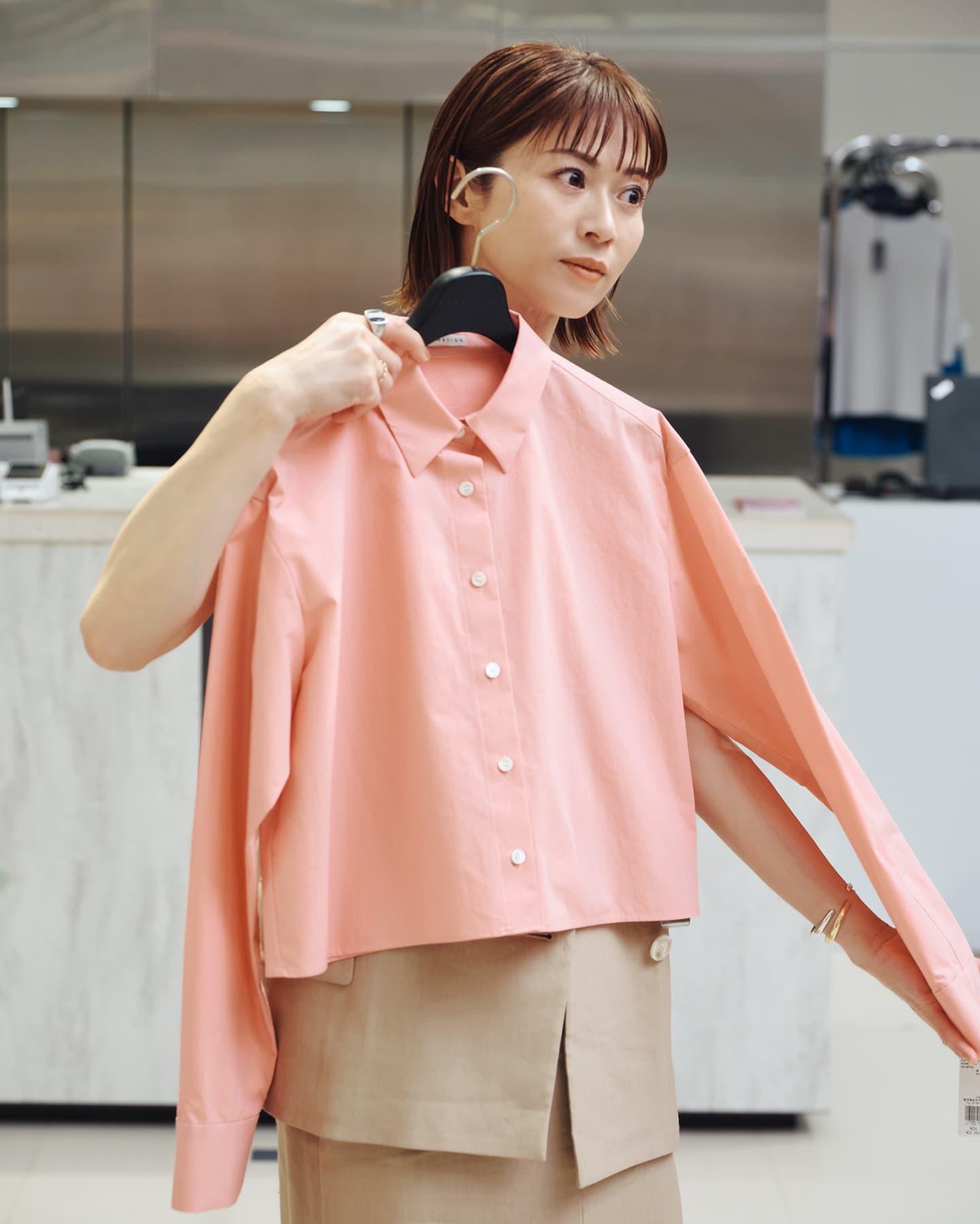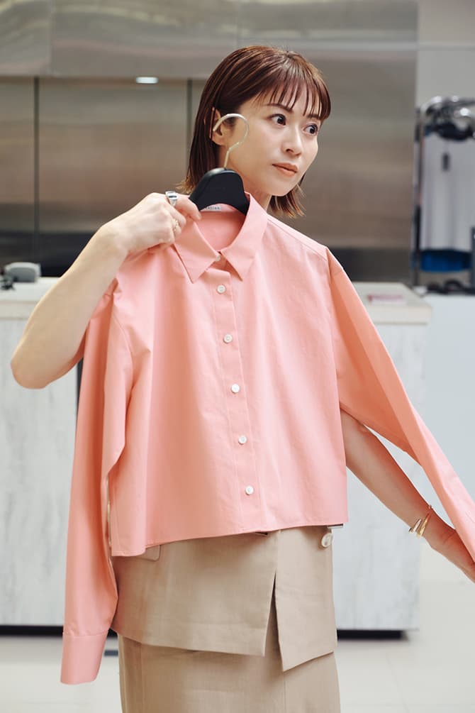 - シンプルだけど、存在感のある“ブランイリス”のシルバーアクセサリーを手に取り、いくつか試着。続いてウエアのコーナーへと足を進めていきます。「クローゼットはモノトーンだらけなんですが、最近大人のピンクが気になっているんですよね」と話しながら、ピンクのブラウスやスウェットを手に取っていました。カジュアルなアイテムを取り入れることも好きと話すご本人。
