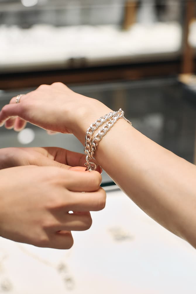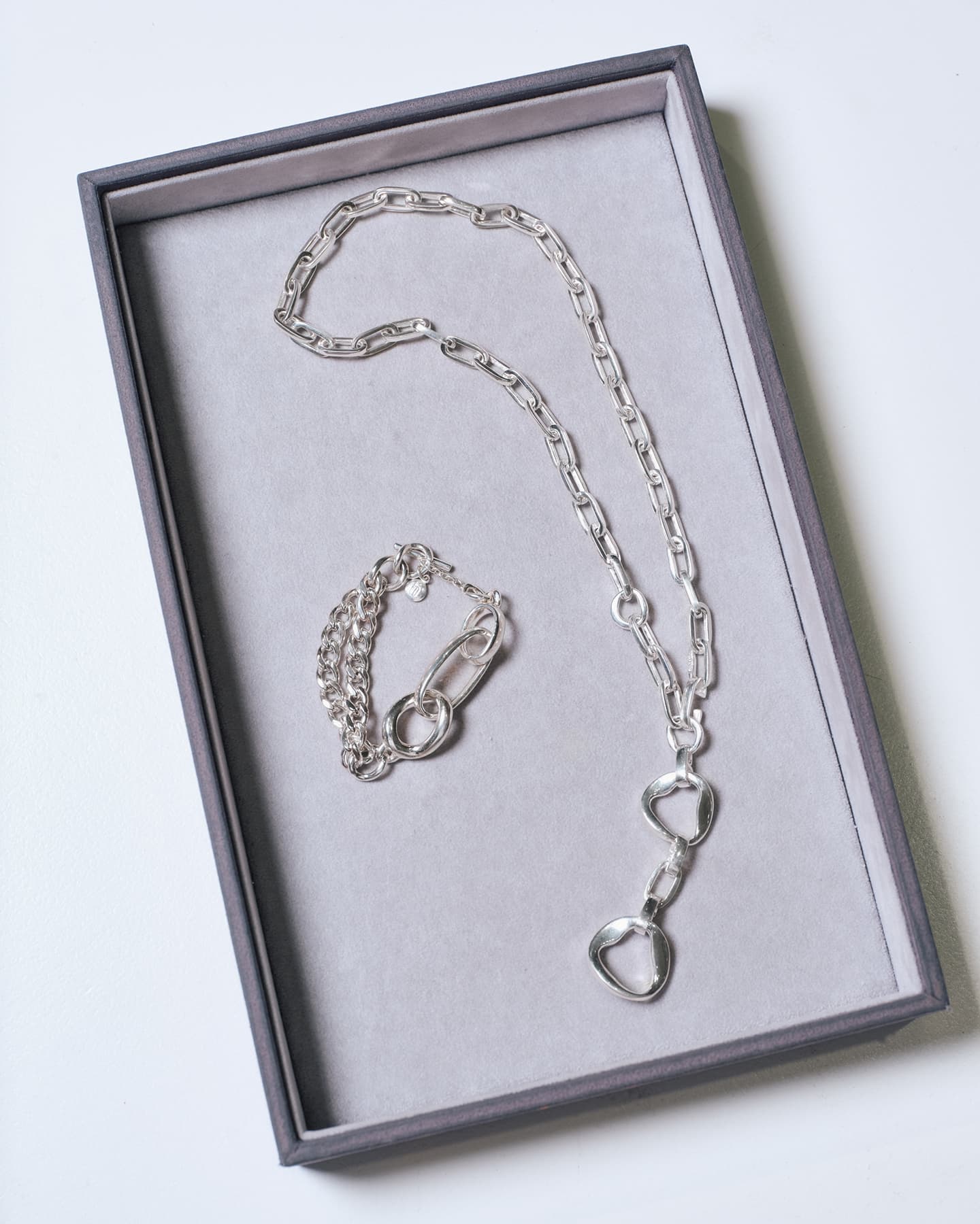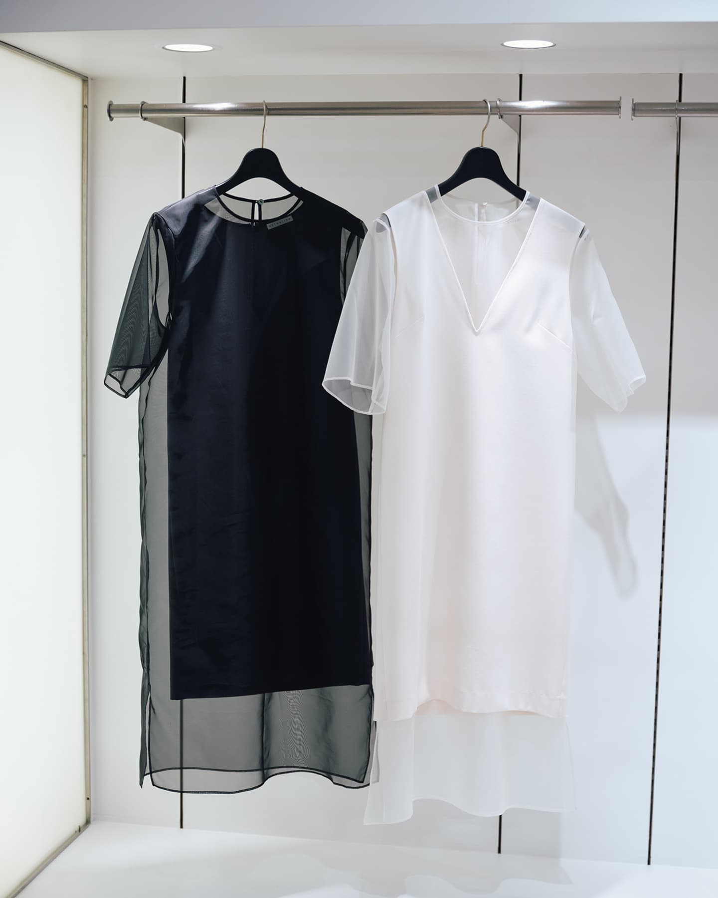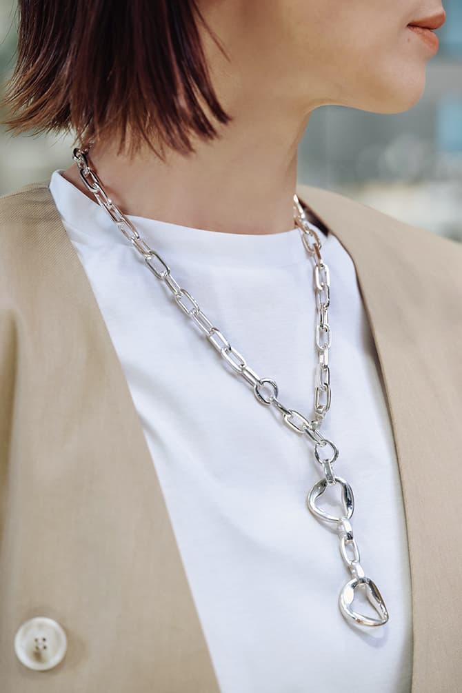 - シンプルだけど、存在感のある“ブランイリス”のシルバーアクセサリーを手に取り、いくつか試着。続いてウエアのコーナーへと足を進めていきます。「クローゼットはモノトーンだらけなんですが、最近大人のピンクが気になっているんですよね」と話しながら、ピンクのブラウスやスウェットを手に取っていました。カジュアルなアイテムを取り入れることも好きと話すご本人。