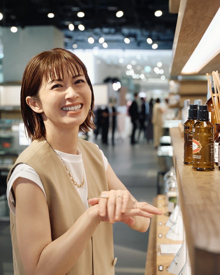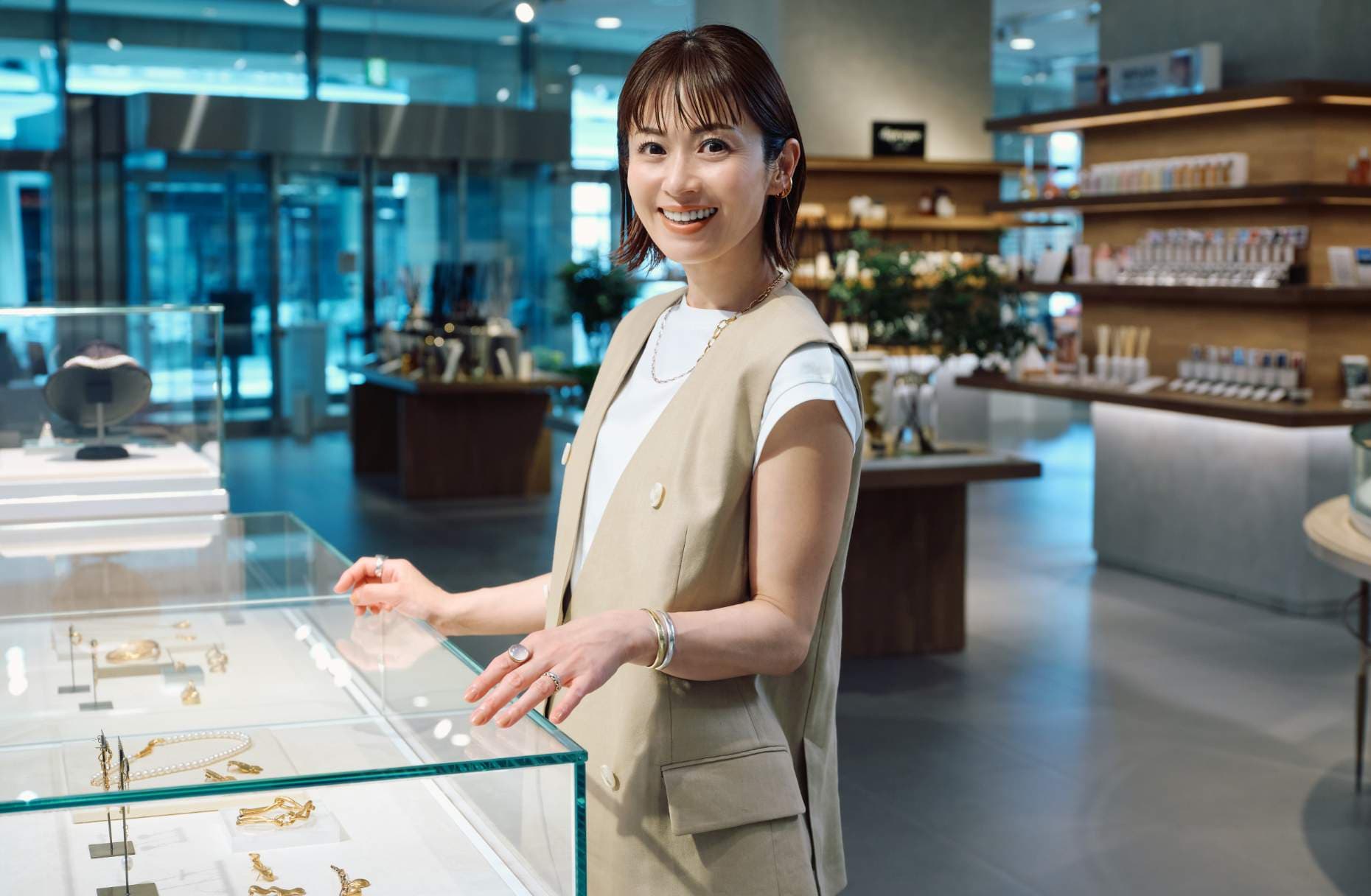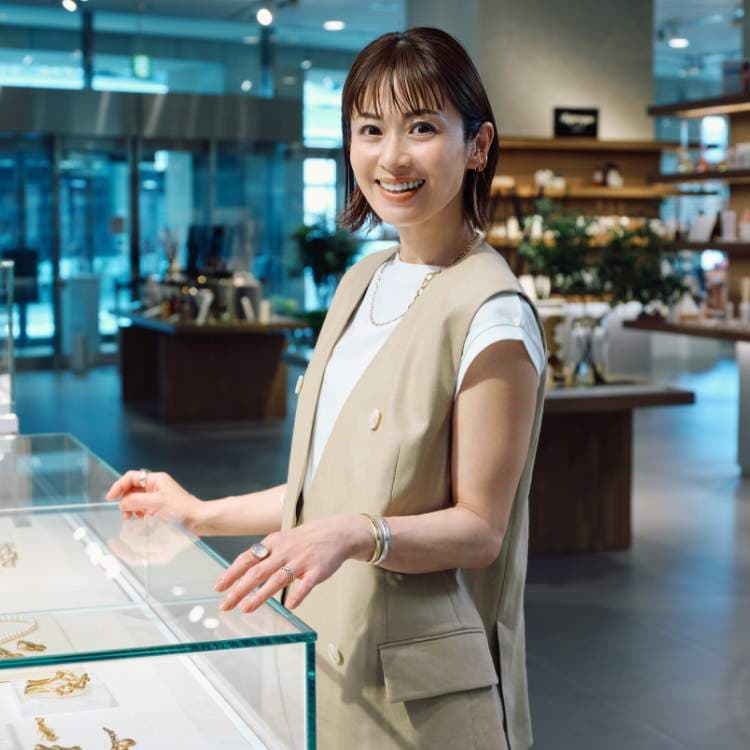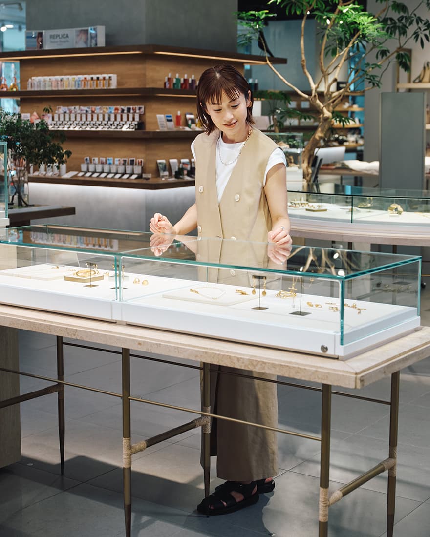 - 「六本木ヒルズのエストネーションにはコロナの前は夫婦でよく来ていました。とても広くて見やすいし、アイテムも幅広い。メンズとウィメンズがあるので夫婦でもファッションを楽しめるところが好きなんですよね。」という畑野さん。久々に六本木ヒルズ店を訪れるこの日を、本当に楽しみにしていたそう。メゾンブランドから国内外の気鋭ブランドまでを揃えたハイセンスなセレクトのウエアや小物、気持ちを豊かにしてくれるキャンドルや香水、そしてフラワーショップまで、六本木ヒルズ最大の面積を誇る広い店内で、まず畑野さんが足を止めたのはアクセサリーコーナー。