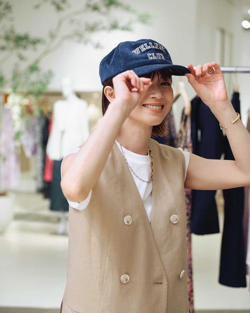 - キャップを試着したときには「エストネーションの小物のセレクトもとても好きなんです。私は帽子をかぶることが多いんですが、以前このお店で買い物をしたとき、気に入った帽子の色が選びきれなくて、色違いで買ったこともありました」という思い出話も披露してくれました。きっちりした大人の装いからカジュアルまで。そのラインナップの広さもショップの魅力なのです。