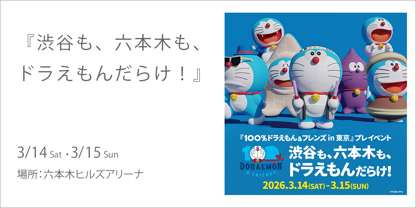有明・東京ドリームパークにて開催される『100%ドラえもん&フレンズ in 東京』のプレイベント『渋谷も、六本木も、ドラえもんだらけ!』が、渋谷と六本木で開催。 六本木では、全長約12mの「巨大ドラえもんバルーン」と、さまざまな表情やポージングを見せる40体以上の等身大ドラえもんが大集結します。