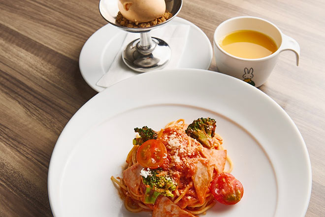 本格イタリアンが楽しめる「アデッソ」。キッズメニューは、ハムとブロッコリーのトマトクリームスパゲッティとドリンクに加え、うれしいバニラジェラート付き。