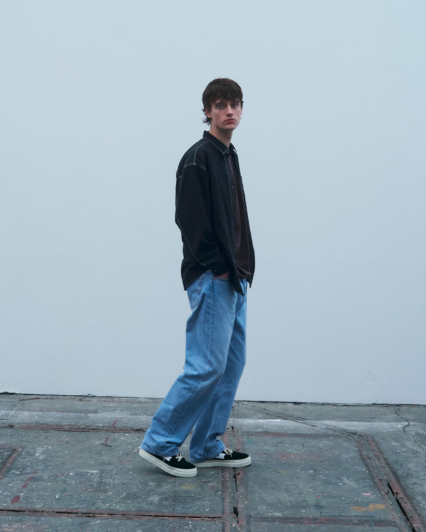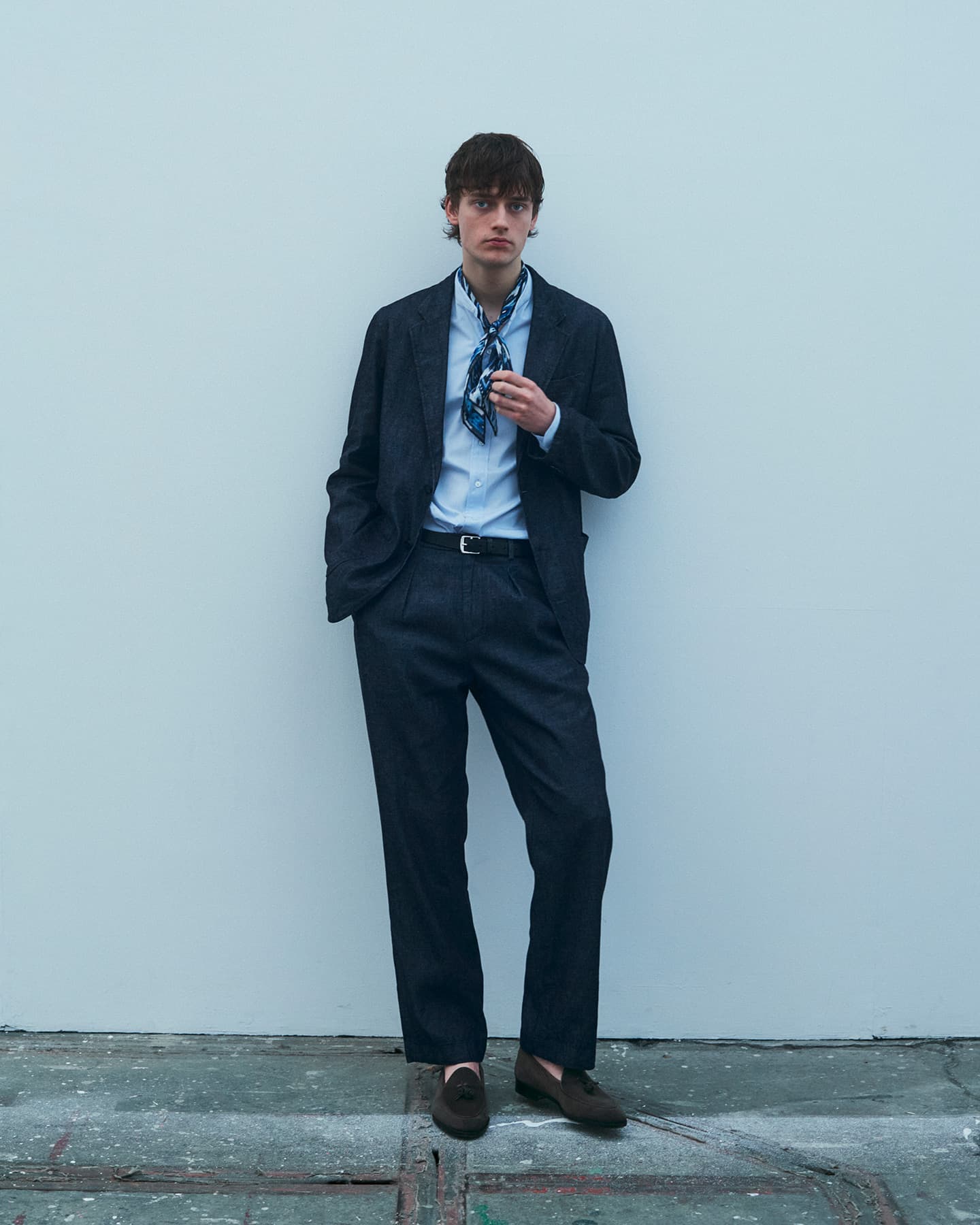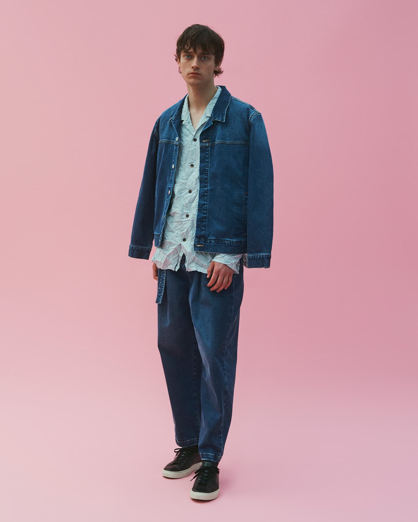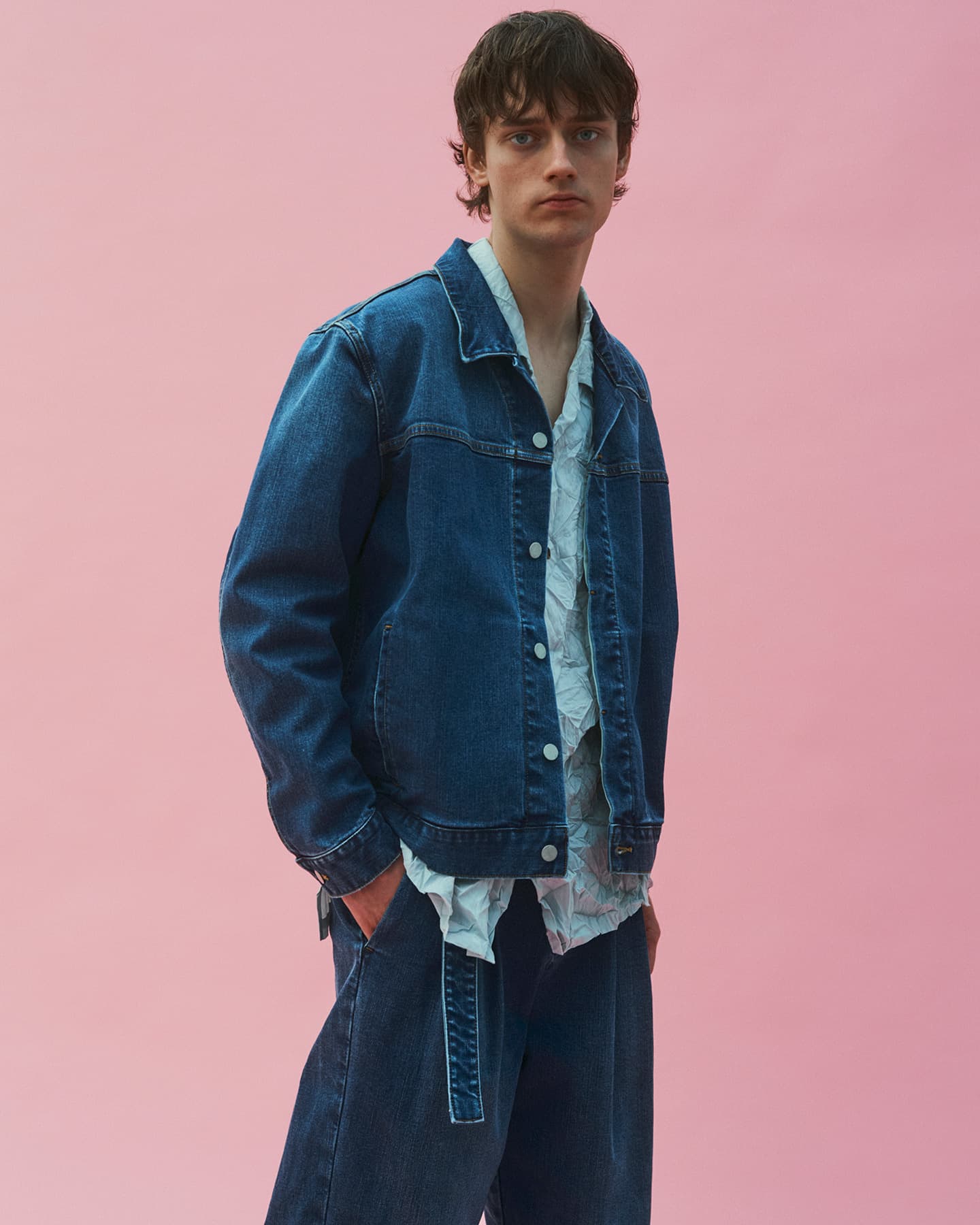 - 荒木大輔(以下A):そうですね。ここ数年デニムは下火でしたもんね。コロナで停滞していたファションの流れが一気に動き出したこともあって変化がついてきたのかな。これまではデニムといえば割とオーセンティックな印象が強かったのですが、近年はそうではないデニムが増えていると思います。オーセンティックに見えるけど意外とワイドで、着るとトレンド感がしっかり出てくるようなアイテムが多い気がしますね。今回は、これから夏に向かって気持ちが軽くなっていくタイミングの提案として、色使いや、程よいルーズシルエットなどで「軽やかさ」を意識したスタイリングにしました。
