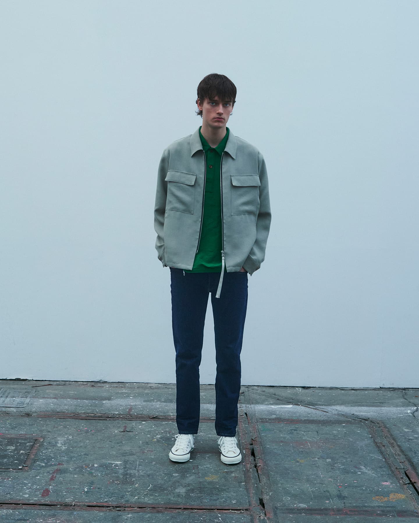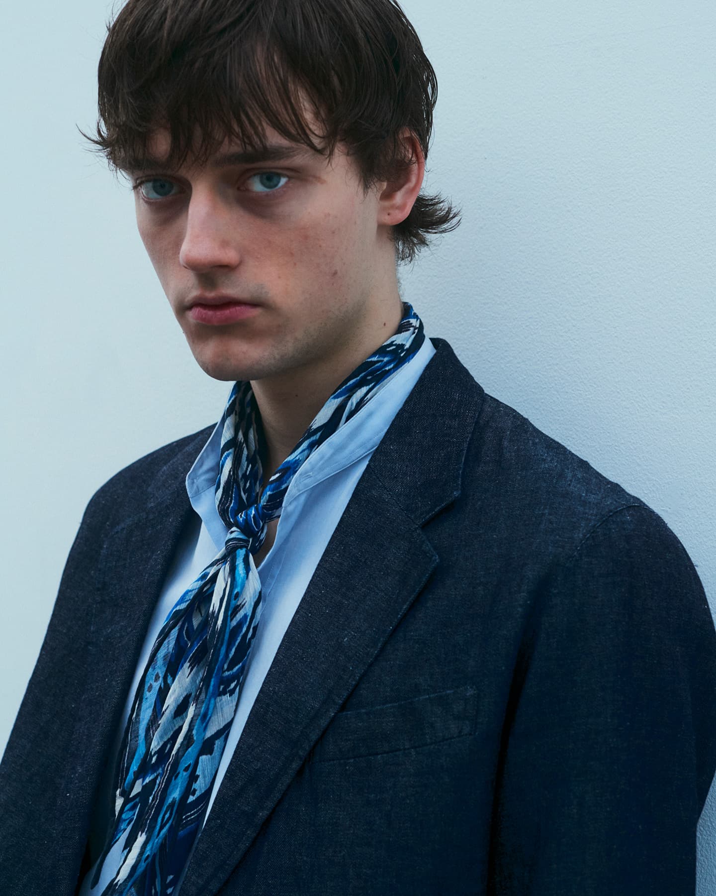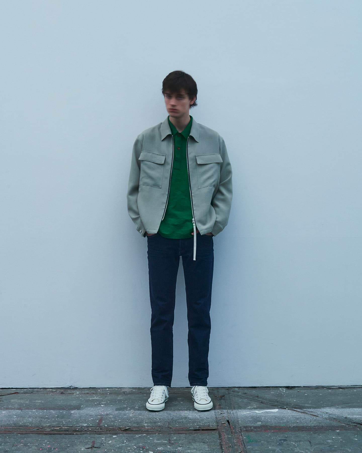 - 荒木大輔(以下A):そうですね。ここ数年デニムは下火でしたもんね。コロナで停滞していたファションの流れが一気に動き出したこともあって変化がついてきたのかな。これまではデニムといえば割とオーセンティックな印象が強かったのですが、近年はそうではないデニムが増えていると思います。オーセンティックに見えるけど意外とワイドで、着るとトレンド感がしっかり出てくるようなアイテムが多い気がしますね。今回は、これから夏に向かって気持ちが軽くなっていくタイミングの提案として、色使いや、程よいルーズシルエットなどで「軽やかさ」を意識したスタイリングにしました。