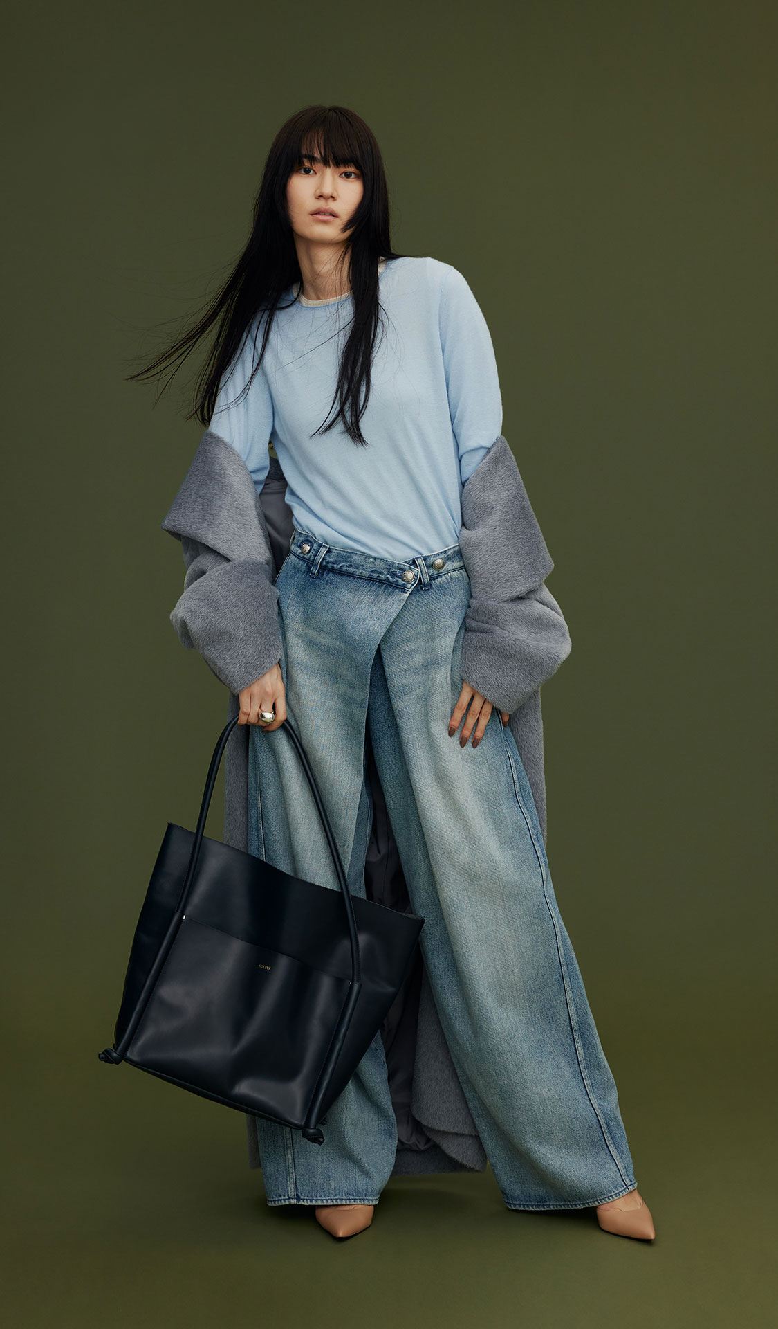 - K : 洋服選びって、着る人のアティテュード、仕草に関わってきますよね。数え切れないほどの洋服を見てきましたが、ある程度年齢を重ねた今では、“品”をファーストプライオリティとして考えています。どんなアイテムでも品よく着こなせていればセンスよく見えるんですよ。お洋服のサイズ感をしっかり保ち、自分にフィットしたものを選ぶことも大切ですね。無理せず着られるものがやっぱりいいと思います。また、空気も乾いて、ドライな印象がある秋冬の街中では、着こなしのどこかに艶感を入れると目を惹くものになると思います。今日の4スタイルにも必ず艶感は入れるようにしました。野暮ったくならず洗練されたムードが表現できるんですよね。