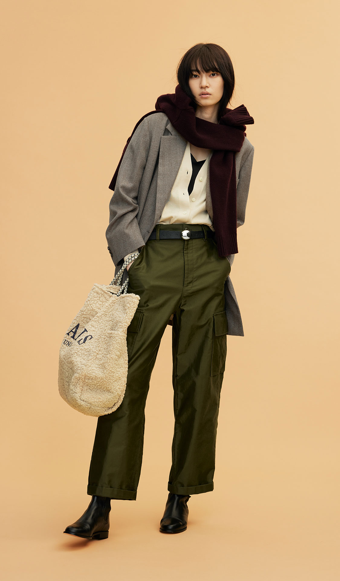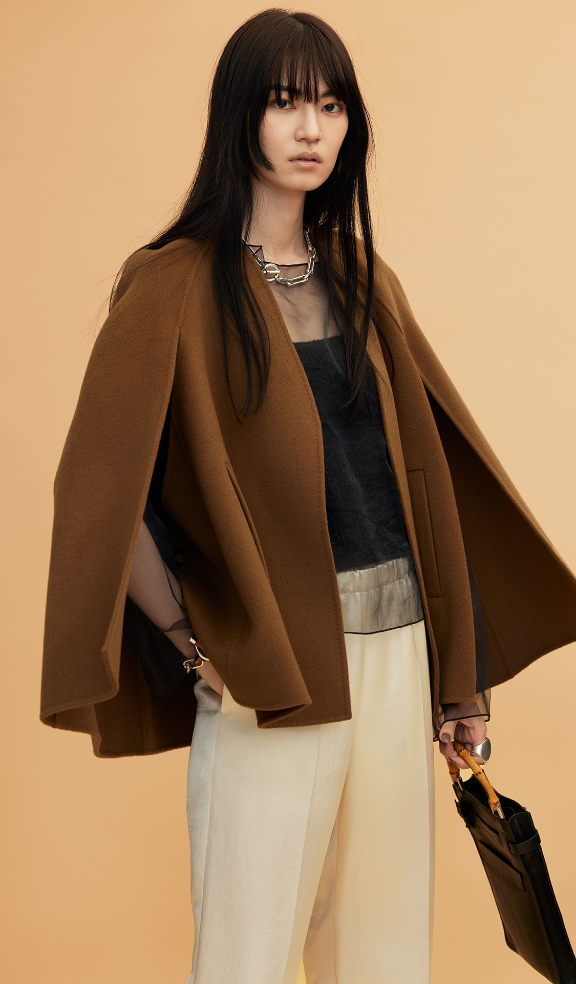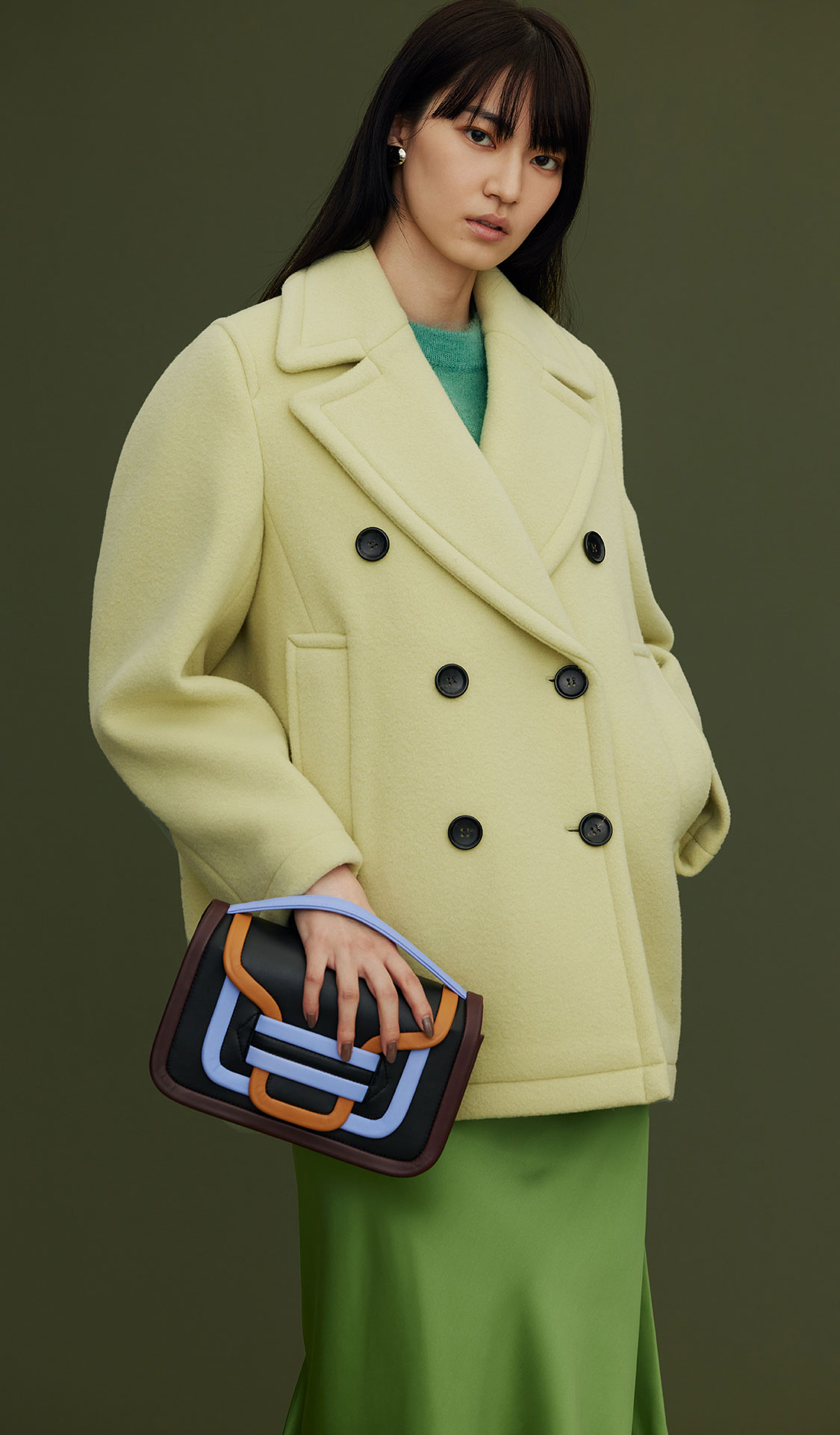 - 風間 ゆみえ(以下K):そうですね。高級感あるロングコート、カラフルなPコート、マスキュリンなビッグシルエットのジャケットに上品なケープとそれぞれのカラーが出せましたね。気持ちが華やかになり、お買い物に出かけたくなるような、ワクワク感、高揚感のあるスタイリングを目指しました。
