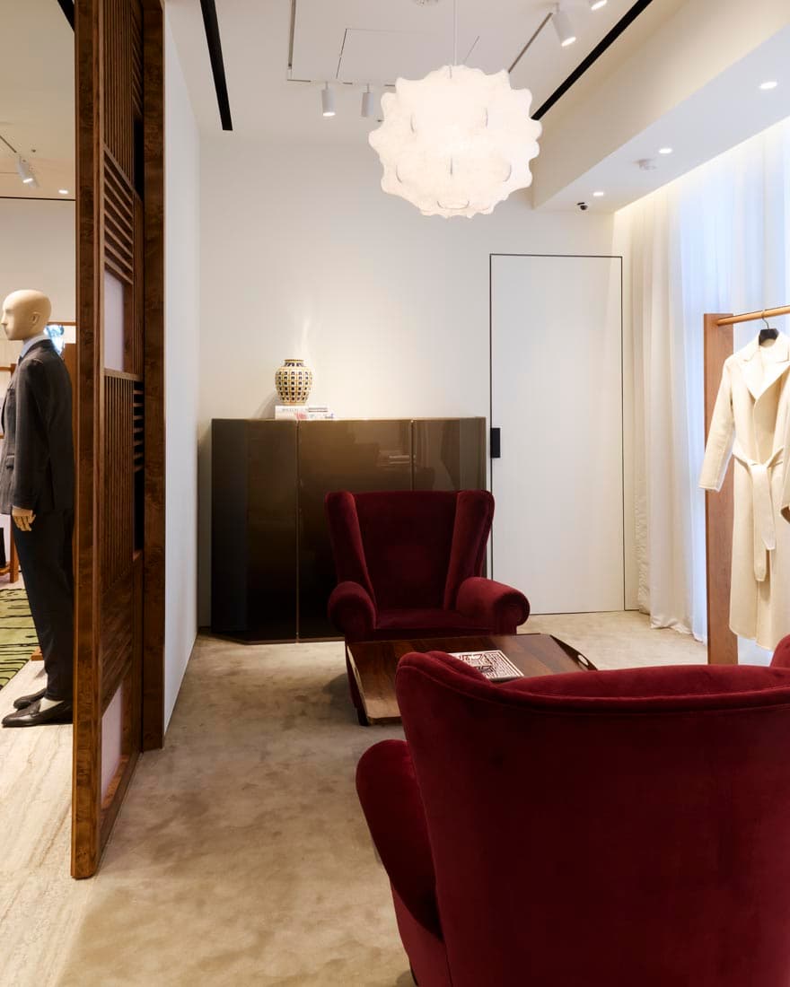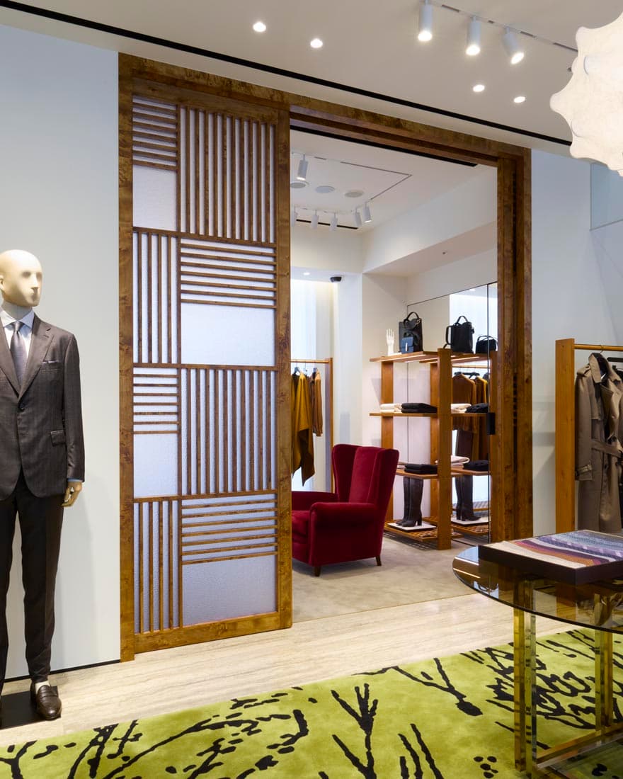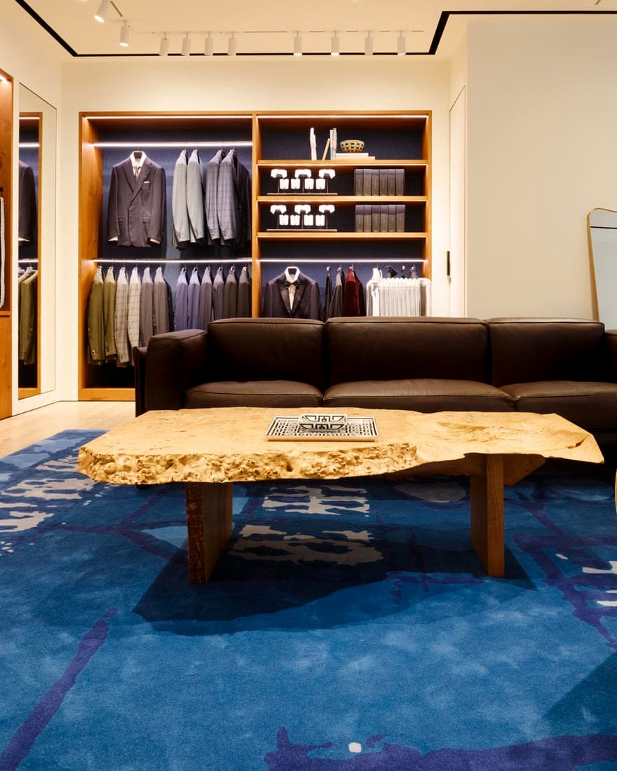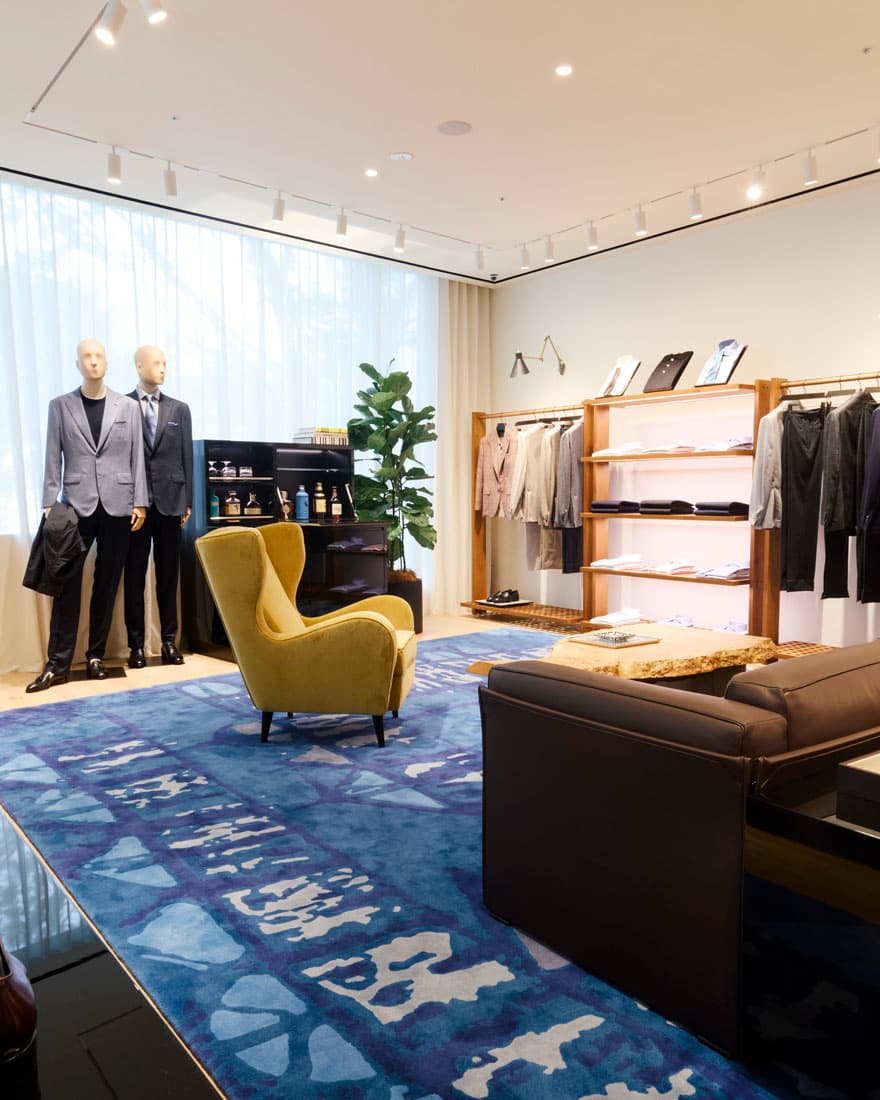 - 店内に入り、まず目に飛び込んでくるサスペンションランプは、1960年にイタリアの名門照明ブランド「Flos」のために、カスティリオーニ兄弟がデザインしたもの。たんぽぽの綿毛を思わせる繊細で美しいフォルムから柔らかな光が注がれます。1階にはブリオーニが提案するライフスタイルの入り口としてレジャーウェアやレザーグッズがゲストを出迎えます。また奥の扉の先から顔を覗かせるのは、ウィメンズコレクション「La Donna」。そして日の光を優しく取り込む木造の階段に導かれ2階へ上がると、ネクタイやレザーバッグをはじめとするフォーマルウェアやパーソナルな時間を楽しめるビスポークサロンが。洗練された紳士のための空間が広がっています。1階では侘び寂びを感じさせる静寂な日本の庭園を表現したグリーンの絨毯、2階では東京タワーの上から見下ろしたような構図で都市の躍動感をブルーで表現した絨毯がゲストを迎え、優雅で洗練された空気を演出。イタリアのMITA(Manifattura Italiana Tappeti Artistici)のテキスタイルから特別に製作されたこの2枚の絨毯は、東京の建築と色彩をインスピレーションとして厳選されており、それぞれのフロアの世界観を作り出す大きな象徴となっています。