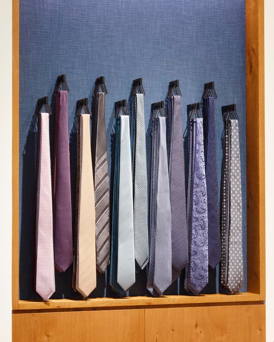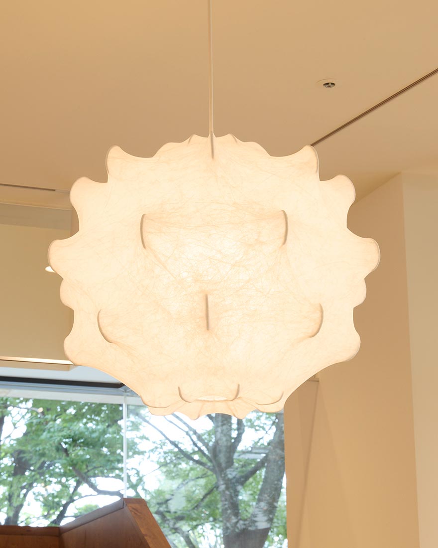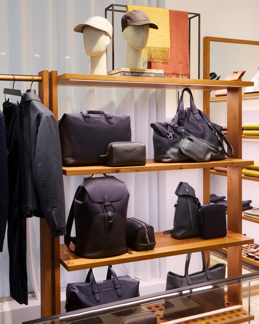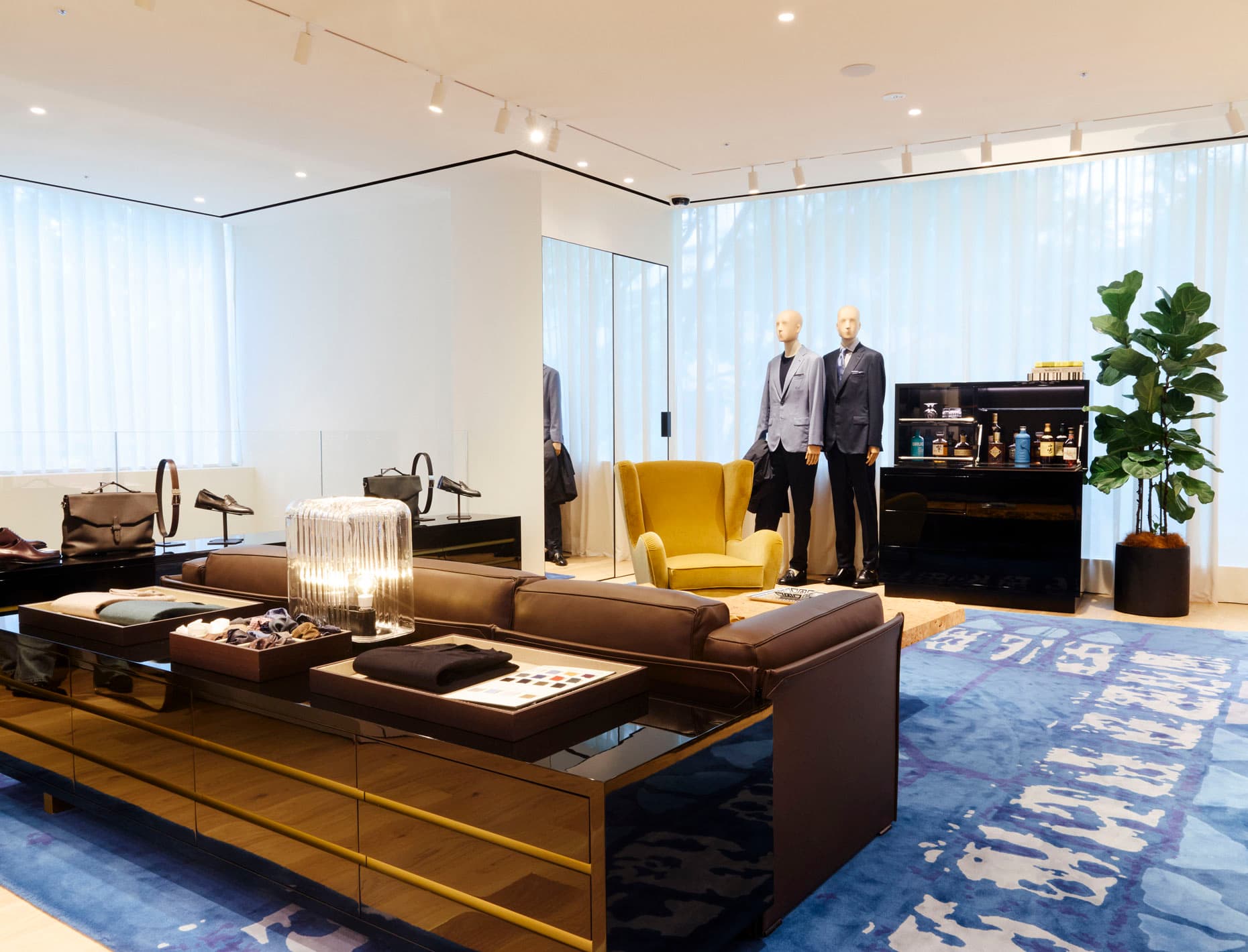 - 店内に入り、まず目に飛び込んでくるサスペンションランプは、1960年にイタリアの名門照明ブランド「Flos」のために、カスティリオーニ兄弟がデザインしたもの。たんぽぽの綿毛を思わせる繊細で美しいフォルムから柔らかな光が注がれます。1階にはブリオーニが提案するライフスタイルの入り口としてレジャーウェアやレザーグッズがゲストを出迎えます。また奥の扉の先から顔を覗かせるのは、ウィメンズコレクション「La Donna」。そして日の光を優しく取り込む木造の階段に導かれ2階へ上がると、ネクタイやレザーバッグをはじめとするフォーマルウェアやパーソナルな時間を楽しめるビスポークサロンが。洗練された紳士のための空間が広がっています。1階では侘び寂びを感じさせる静寂な日本の庭園を表現したグリーンの絨毯、2階では東京タワーの上から見下ろしたような構図で都市の躍動感をブルーで表現した絨毯がゲストを迎え、優雅で洗練された空気を演出。イタリアのMITA(Manifattura Italiana Tappeti Artistici)のテキスタイルから特別に製作されたこの2枚の絨毯は、東京の建築と色彩をインスピレーションとして厳選されており、それぞれのフロアの世界観を作り出す大きな象徴となっています。