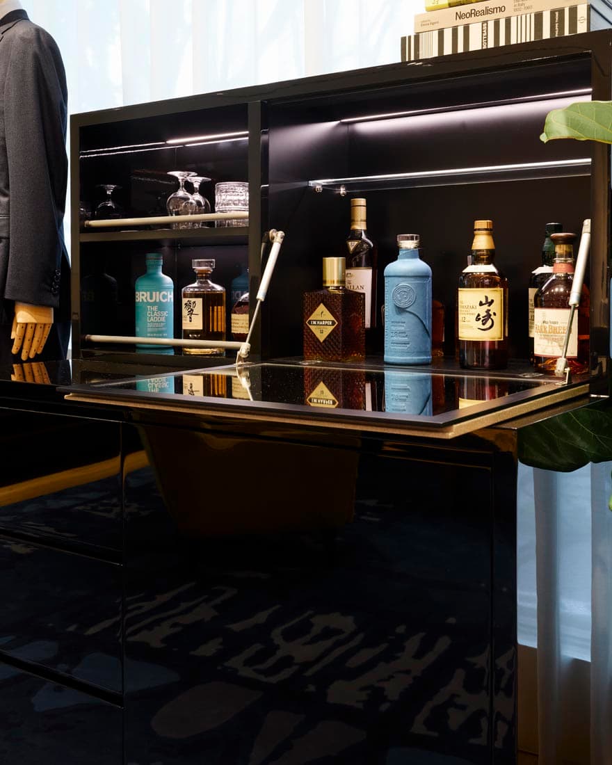 - 1階は奥の部屋の扉を閉じることで、内側がまるで茶室のようにプライベートな空間となり、備え付けのティーバーでは中田英寿氏監修による日本茶HANAAHU TEAを飲食店以外で唯一味わえます。2階では、ウイスキーを嗜みながらビスポークの特別なオーダーを。他店とは一線を画した贅沢な空間を堪能できます。