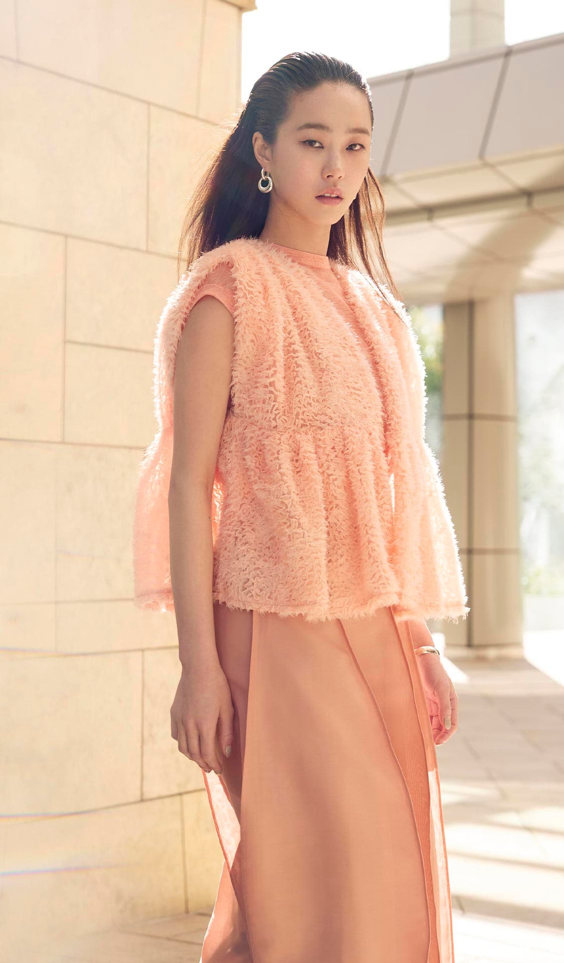春の陽光とシンクロするパステルオレンジで、全身を統一したエレガントな装い。軽やかなリボンヤーンのジレとロングスカートでボリューミーなシルエットを作り、インナーにはノースリーブのニットを合わせ、抜け感を演出。上品な肌見せが大人の魅力を引き立てます。