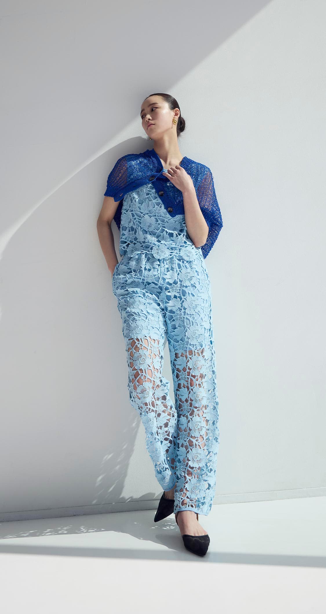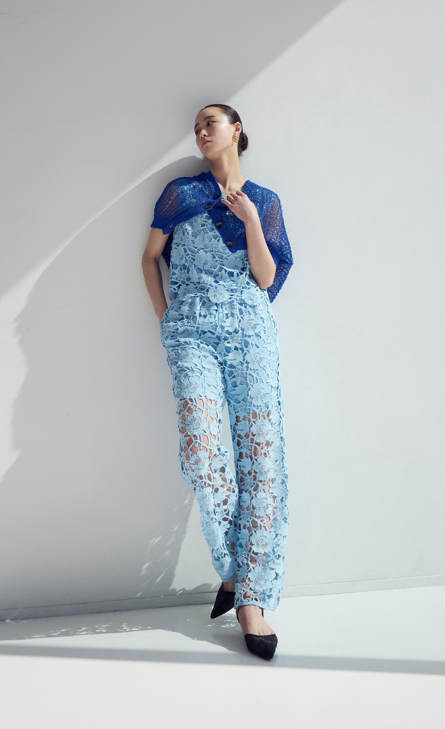 爽やかで気持ちの良い水色が目を惹くノースリーブトップスとパンツのセットアップスタイル。透け感ある繊細なレースが大人の女性を演出します。少し肌寒い時は、濃いブルーのカーディガンを羽織って、色のグラデーションを楽しむのもおすすめ。