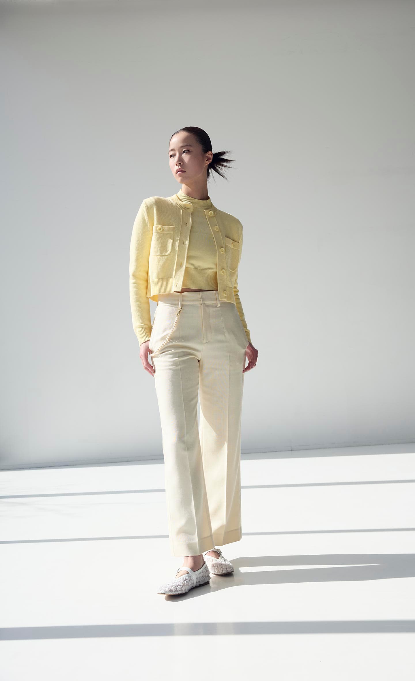 明るいパステルイエローのカーディガンとニットを重ねた大人のカジュアルコーデは、同系色のベージュのパンツを合わせ、上品にまとめた着こなしに。花をモチーフにしたフラットシューズが、エレガントな遊び心をプラスします。