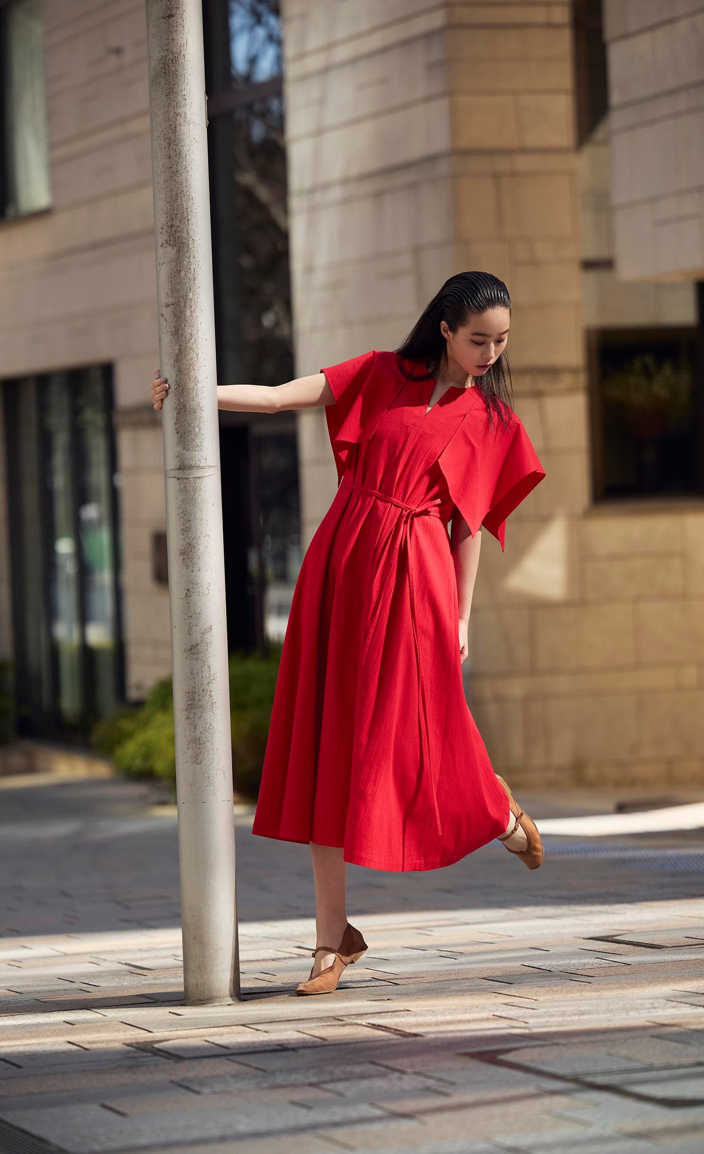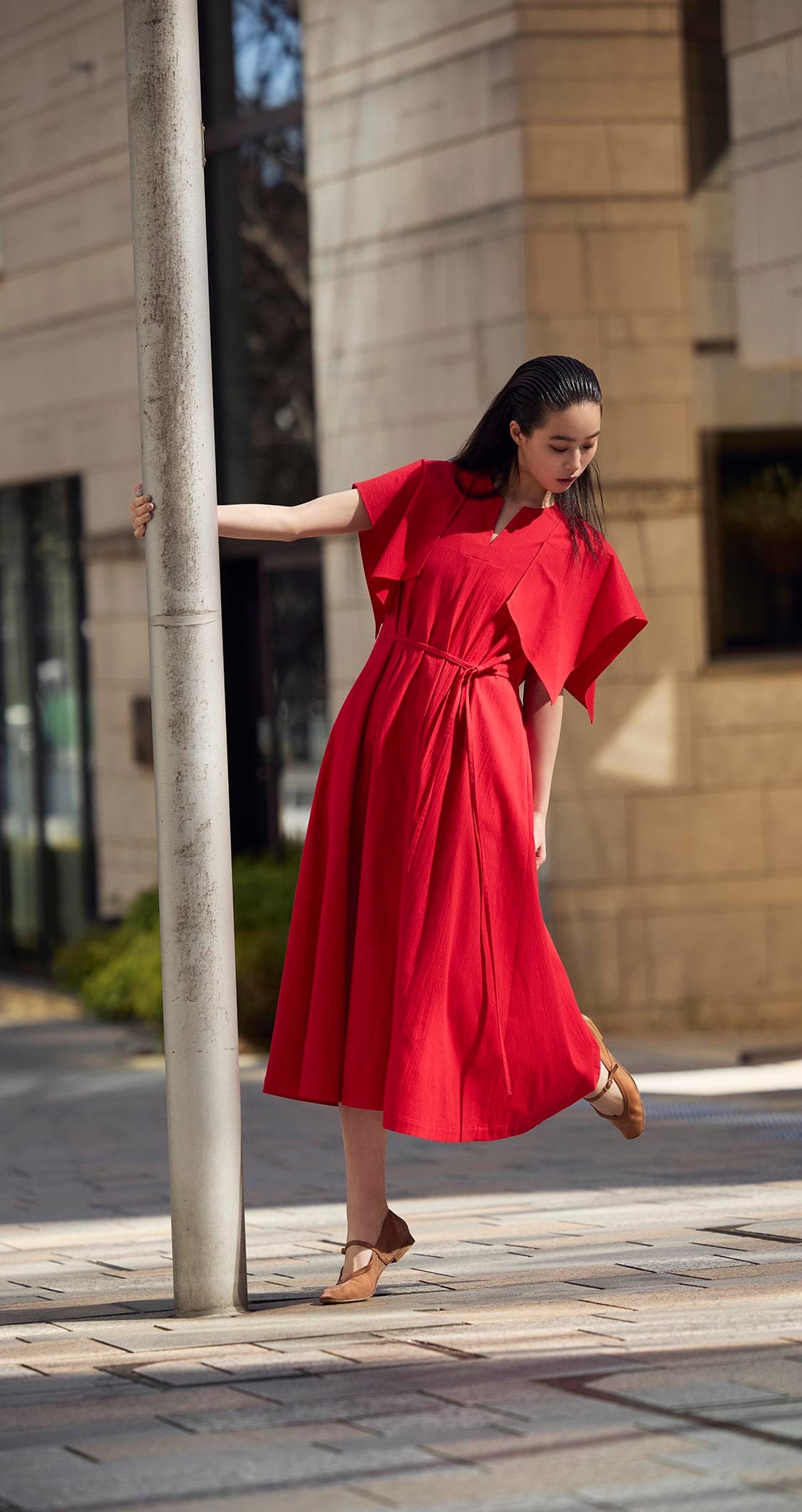 目の覚めるようなビビッドな赤のワンピースは、明るい気分をさらに高めてくれそう。個性的なフレア袖とAラインのシルエットがモダンな印象を与えるアイテムは、着心地が良く軽いサッカー素材も魅力。華やかな装いは、春の街によく映える。