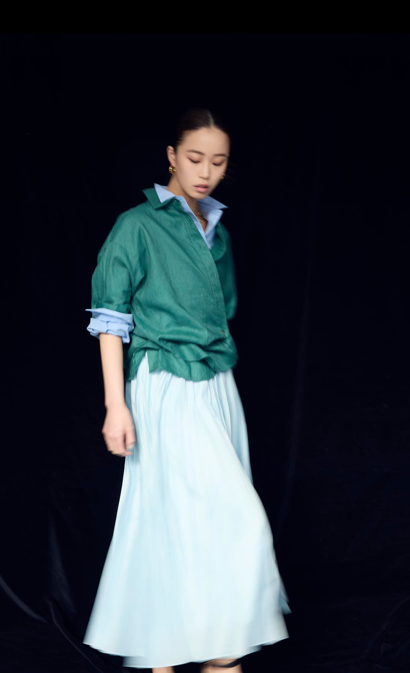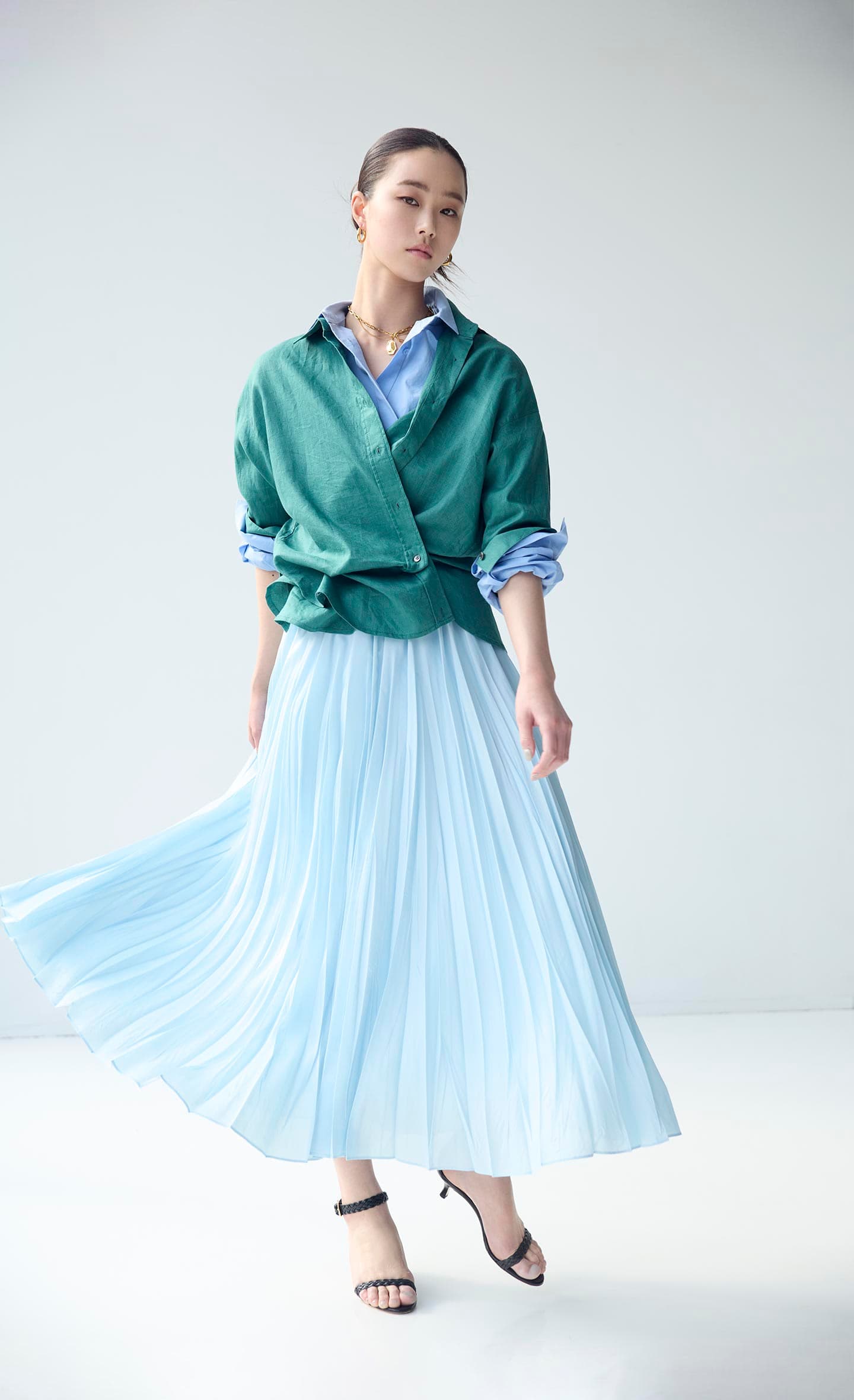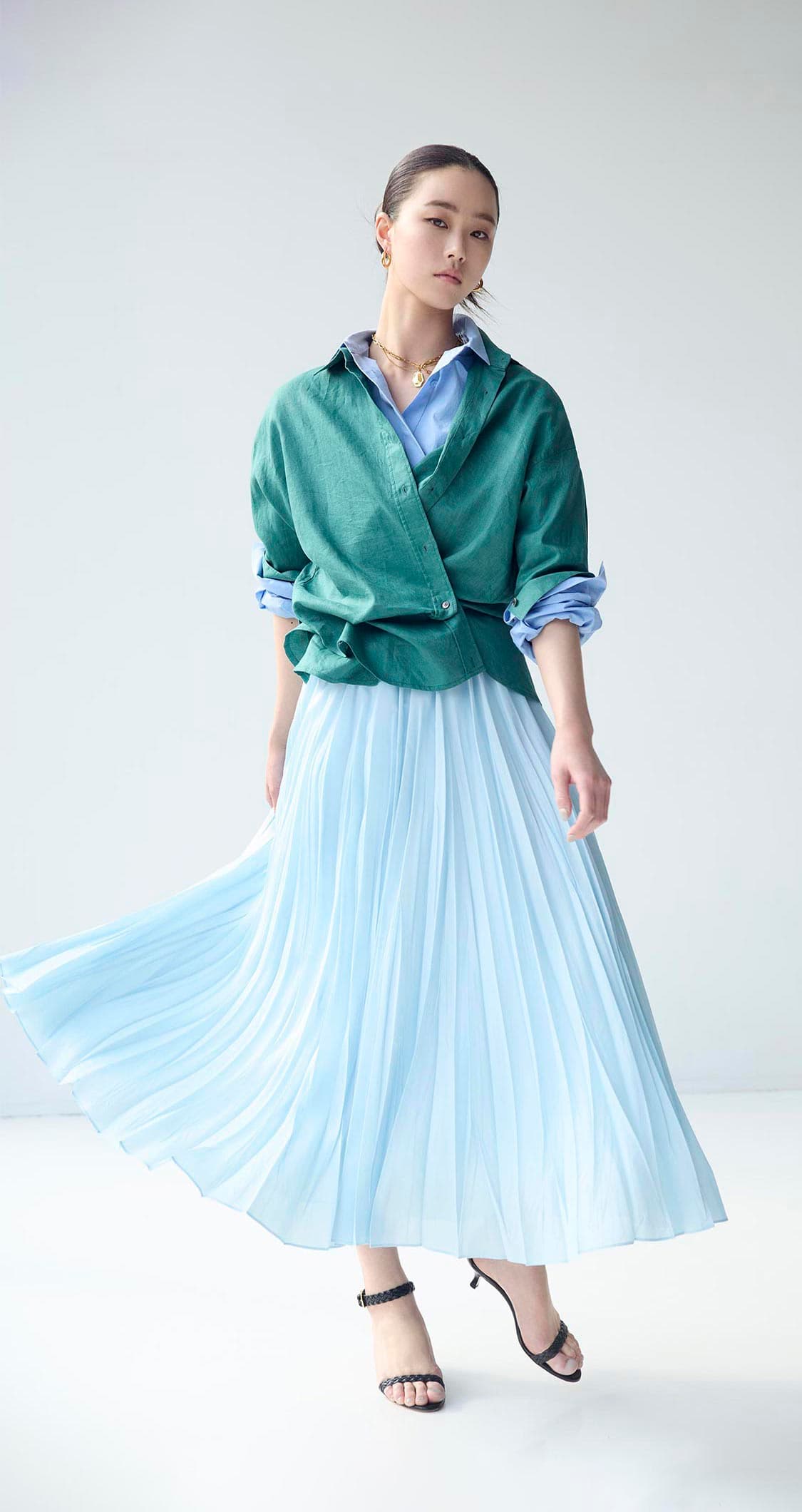 エメラルドグリーンとスカイブルーのシャツをレイヤードし、フレアスカートを合わせたモダンな休日スタイル。スマートで軽やかな印象を備えたコーディネートは、高級感と華やかさをプラスする首元と耳元のゴールドアクセサリーもポイント。