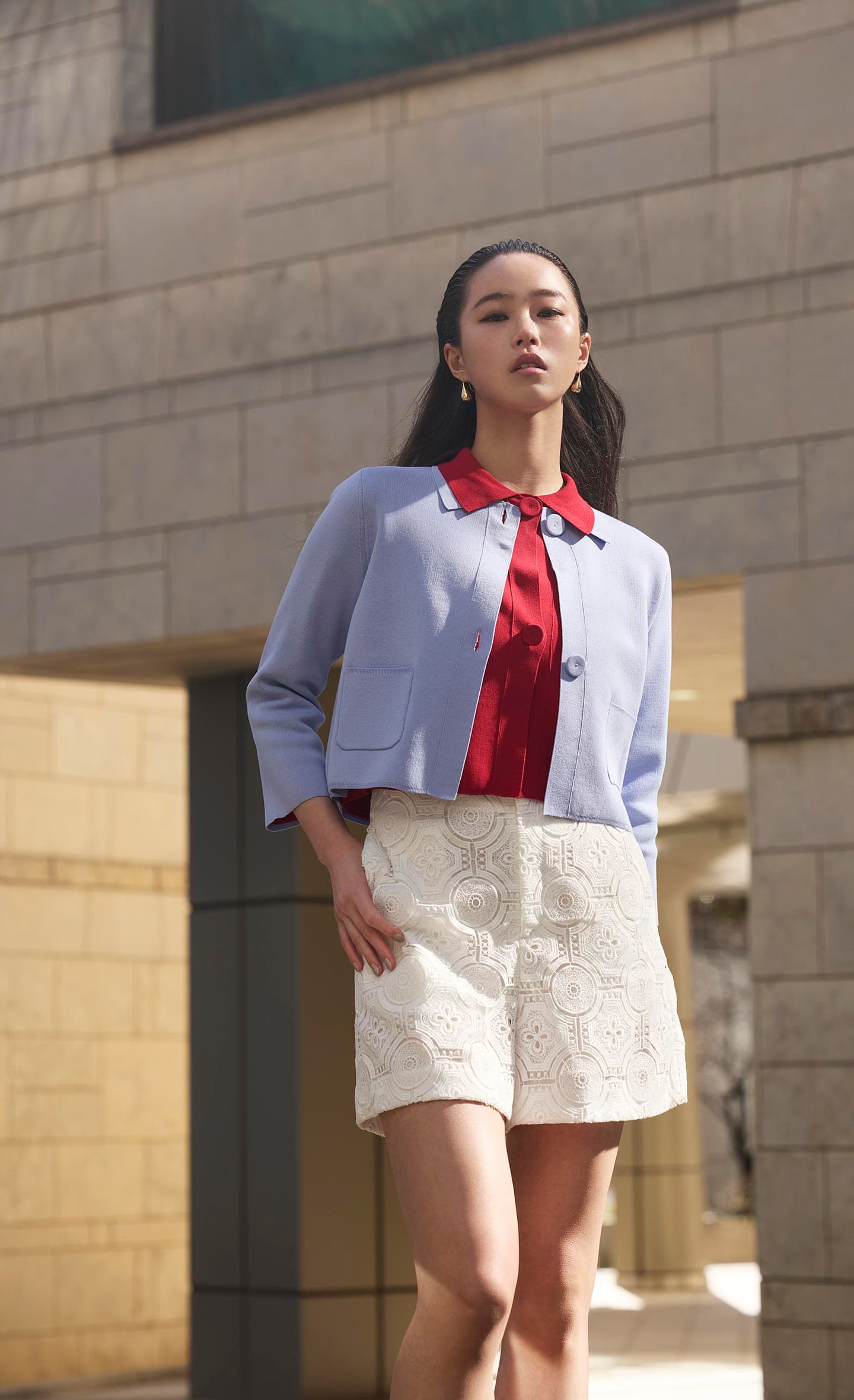 淡いパープルと鮮やかなレッドのニットをレイヤード。配色のセンスが光る着こなしは、レースが施されたホワイトのパンツとのコントラストも美しい。カジュアルなムードをカラーリングで大人に昇華した、モダンで上品な装いです。