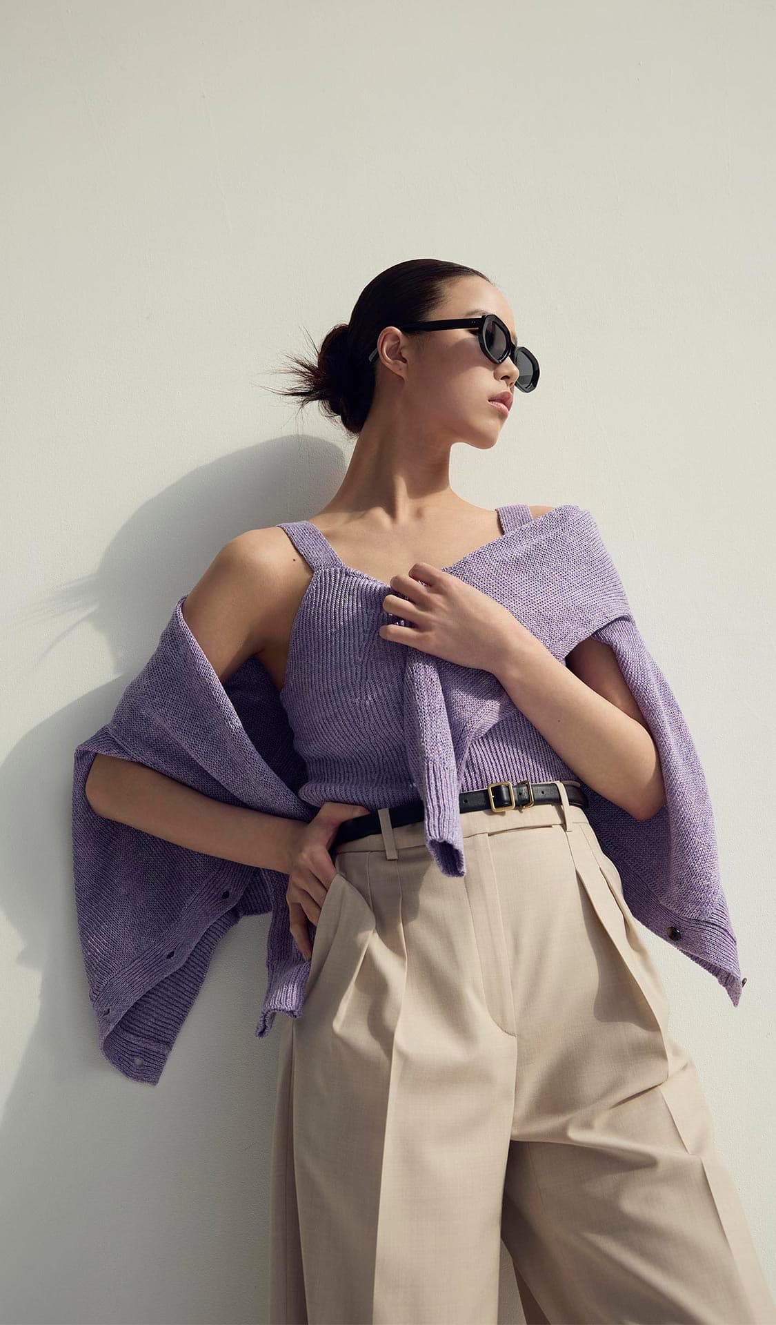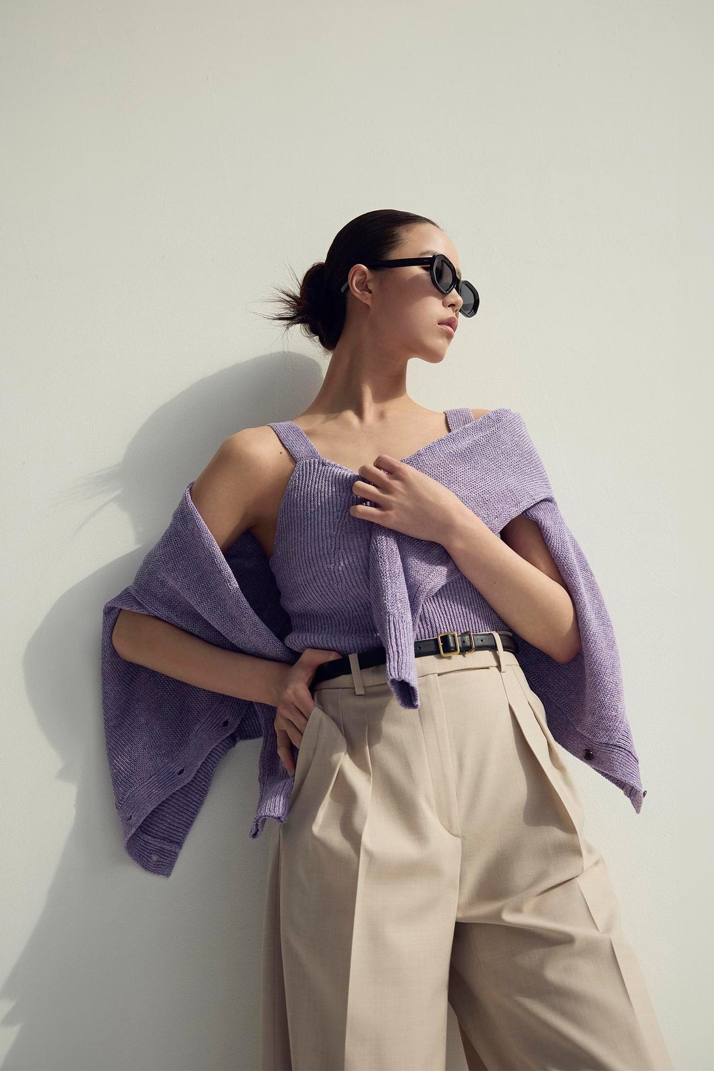 大人の印象漂う上品なパープルをメインカラーにしたコーディネート。ニットタンク&カーディガンを主役にベージュのベルト付きワイドパンツを合わせ、2トーンカラーでリゾートな雰囲気を感じさせる着こなしは、肌見せと小物使いで遊びを効かせるのもポイントです。