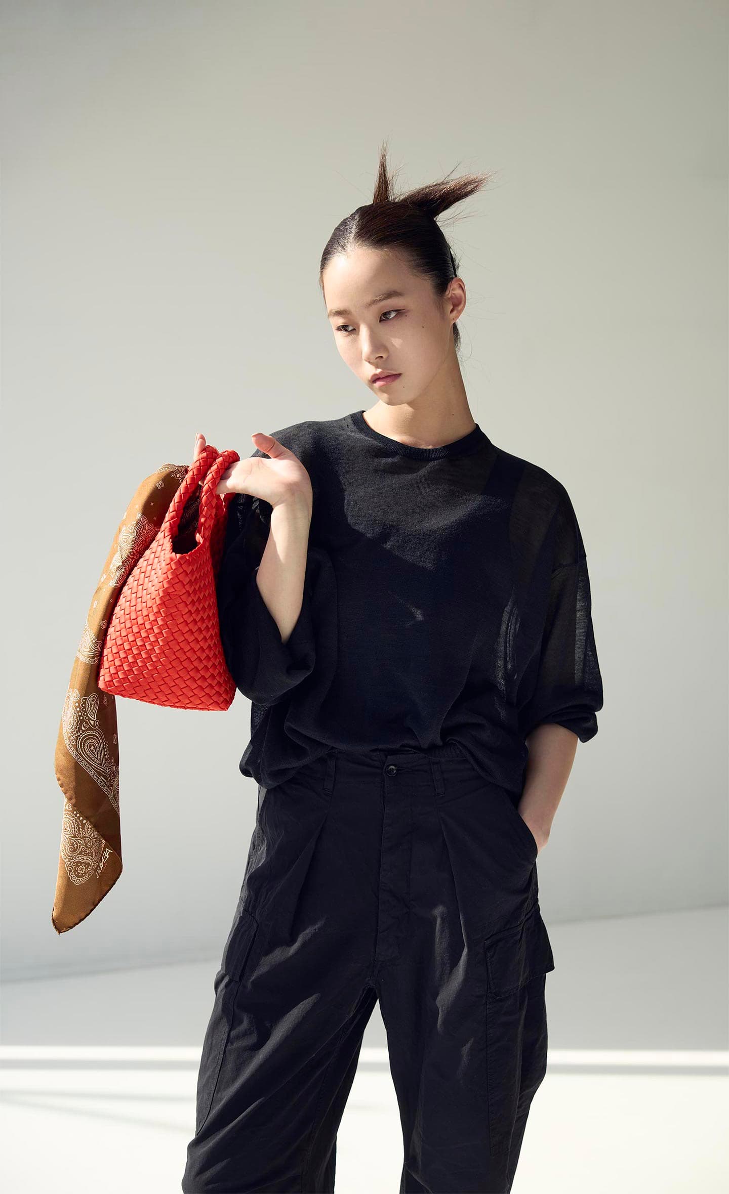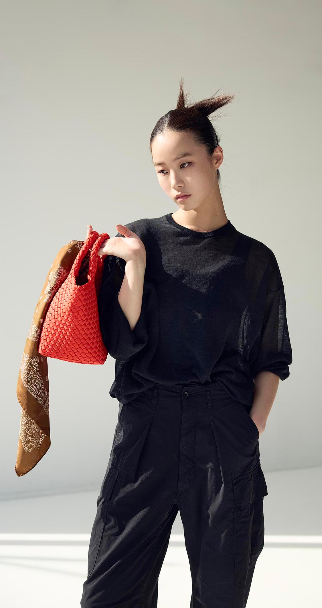 トップスとカーゴパンツをブラックでまとめたクールな着こなしは、透け感あるニットと相まって、エレガントな大人の魅力を引き立てます。黒はファッションに欠かせない色の一つ。彩り豊かなアイテムがある中で、あえてのオールブラックコーデの選択は、街で確かな存在感を発揮してくれます。