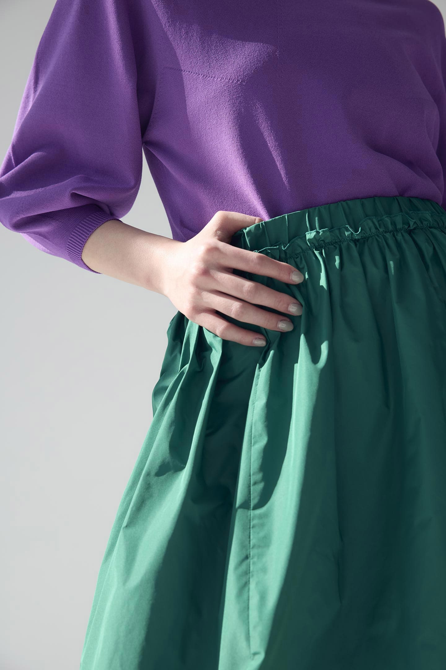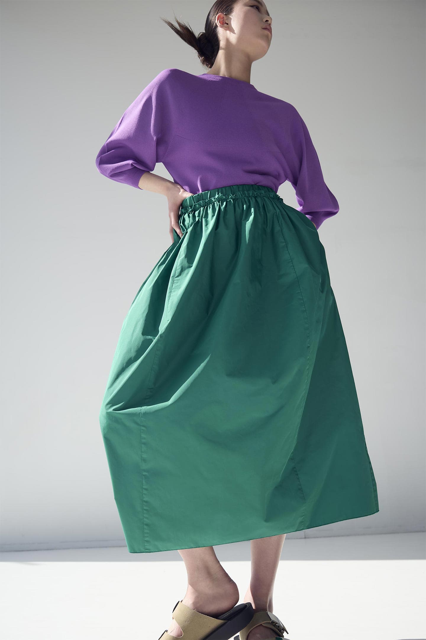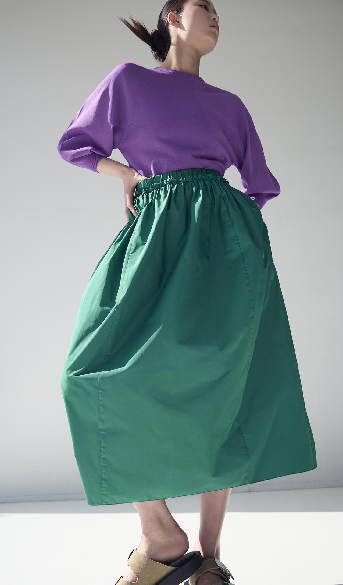紫のトップスと緑のスカートの華やかなカラーリングが光る、春の大人のシンプルスタイル。上品さを備えつつも、ウエストのギャザーとサンダルがリラックスムードを演出する着こなしは、タウンユースとして、ワンマイルウエアとして、さまざまな場面で活躍してくれそう。