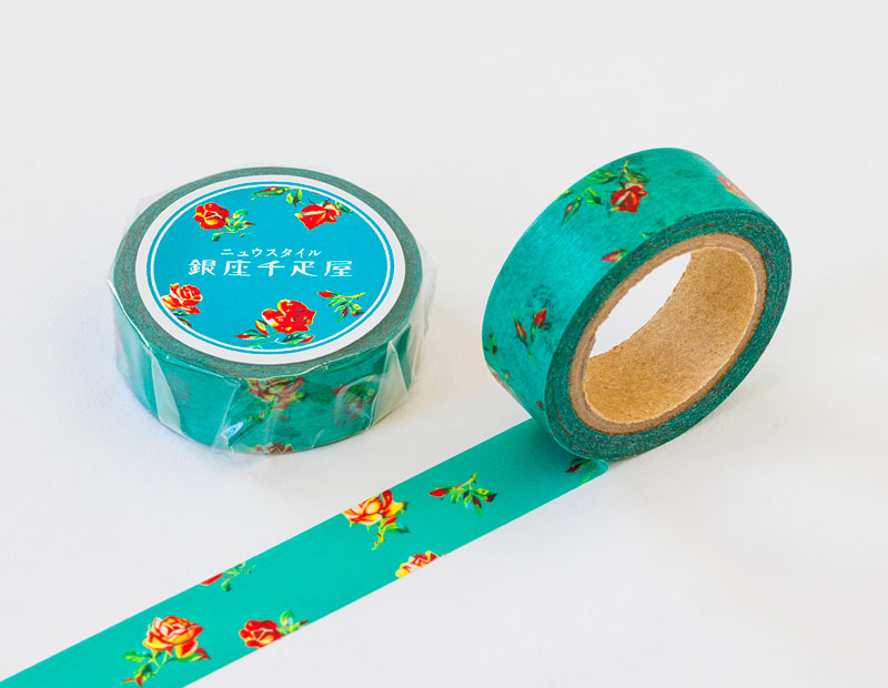 お馴染みのバラ柄の包装紙モチーフのマスキングテープです。⽸と並べても可愛いですね。