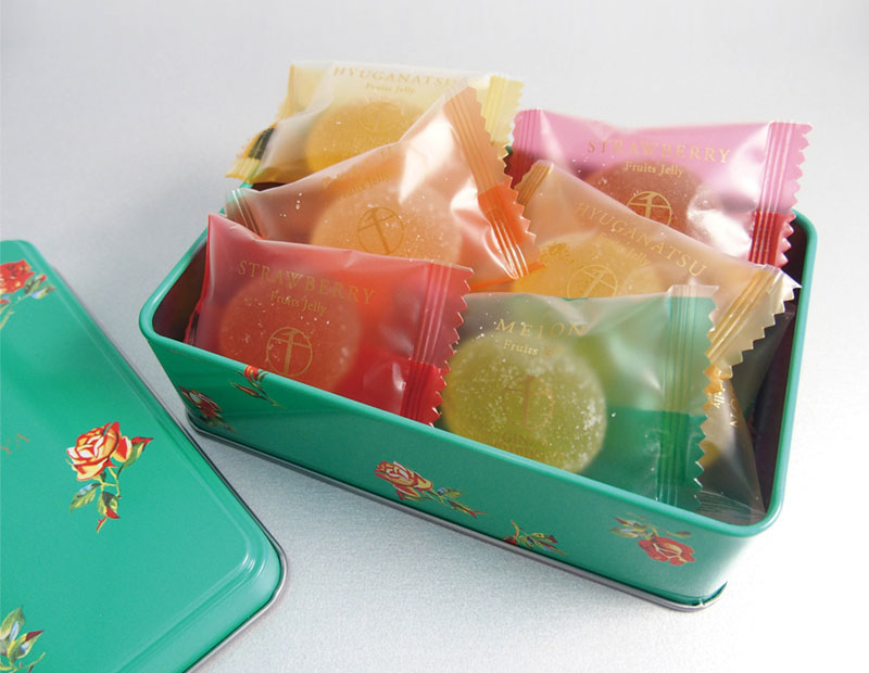 国産果汁を贅沢に用いたフルーツゼリー。白桃、とちおとめ、メロン、日向夏の4種の詰め合わせ。包装紙と同じデザインの缶もかわいくて喜ばれること間違いなし。