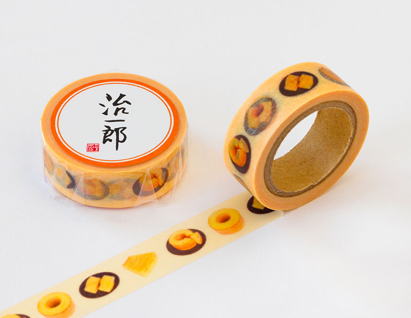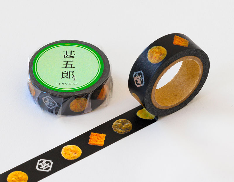 黒ベースに甚五郎の一口サイズの米菓を並べたレトロなマスキングテープ。