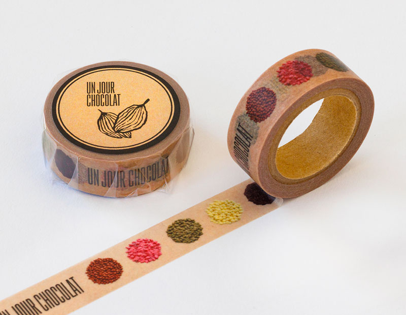 アンジュールショコラの包装をイメージしたクラフト紙風の色味のテープに、ベビーラウンドショコラを並べました。