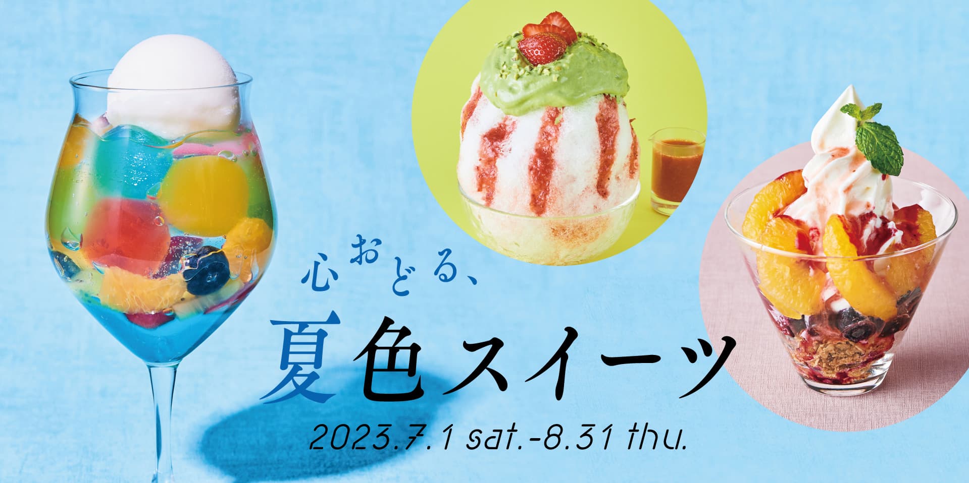 かき氷、ソフトクリーム、フルーツゼリーなど、カラフルな夏色スイーツが揃いました。