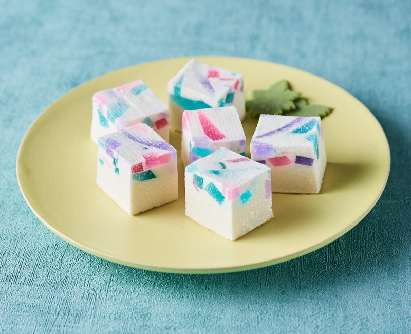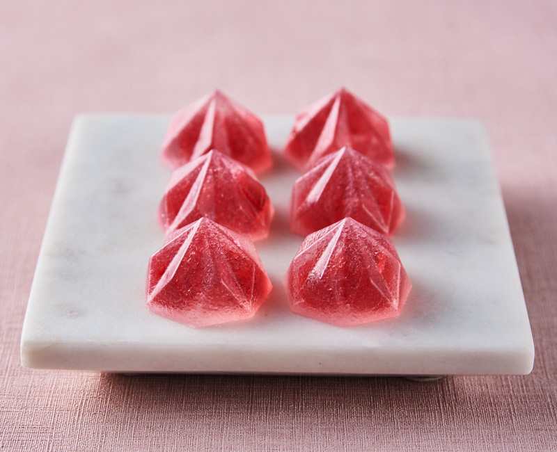 表面のシャリッとした舌触りと寒天のなめらかな食感、中心のゼリーのもちっとした食感のコントラストが楽しめる琥珀糖。アドベリー(ボイセンベリー)味の新感覚の和菓子です。