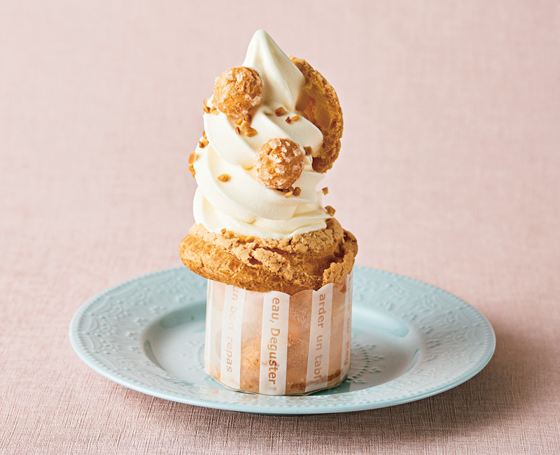 カスタードクリームをたっぷり詰めたシュークリームに、濃厚なソフトクリームを乗せたシューソフト。あられ糖をふったシュー皮のサクサクした食感がアクセントです。