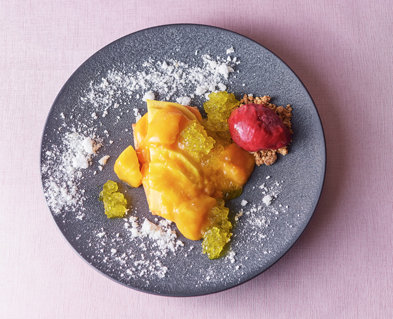 濃厚なカスタードクリームとマンゴーをのせて焼き上げたパイ。ごろっとしたマンゴーとミントの〝ジュレ〟の清涼感がよく合います。濃厚な自家製ラズベリージェラートとともに。