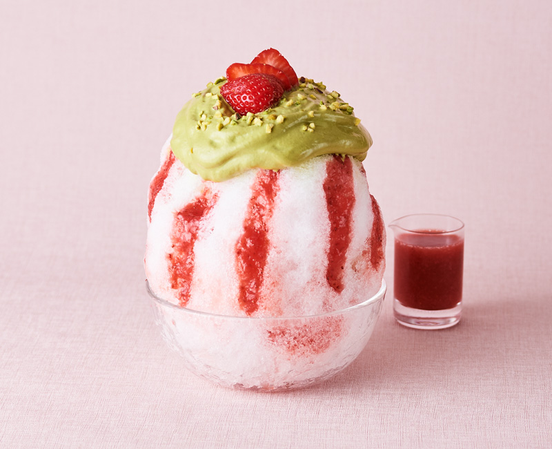 甘酸っぱいいちごのソースと中にはいちごのコンポート。抹茶&ピスタチオのなめらかで、軽い口あたりのエスプーマをのせたフワフワのかき氷です。お好みで別添えのいちごのソースをさらにかけてお楽しみください。