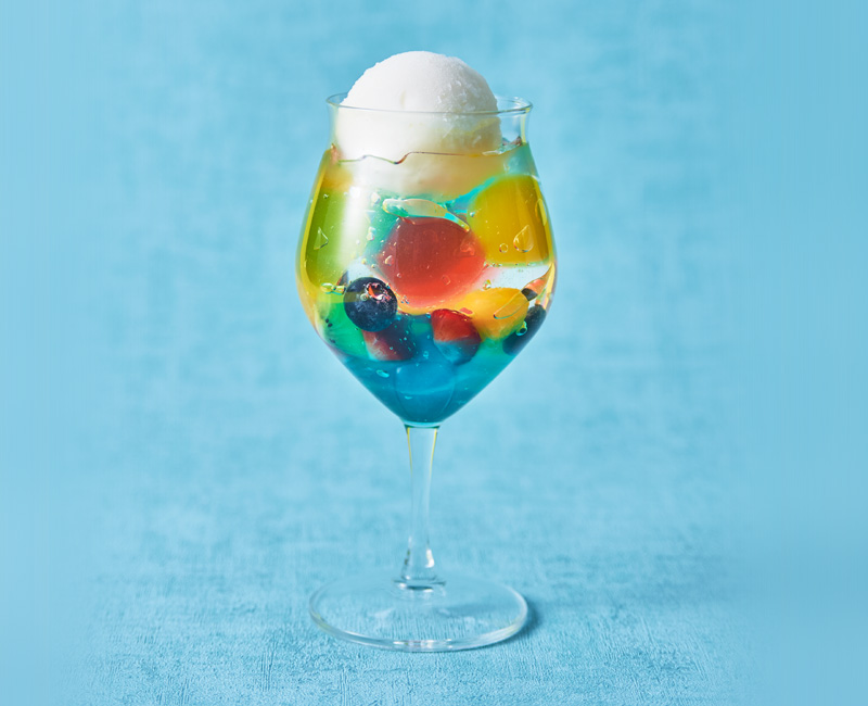 ブルーキュラソーのゼリーに旬のフルーツと4種のゼリーボールを浮かべ、ラ・フランスのジェラートをトッピング。ジェラートはシャンパンに変更可能です(追加料金あり)。