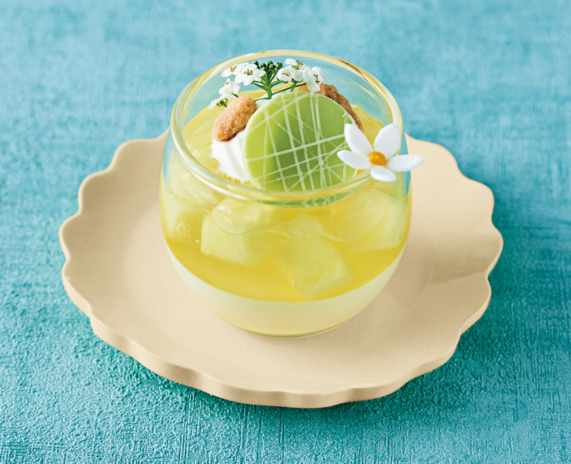 フレッシュメロンとレモングラスを使ったオリエンタルな香りのジュレと、アーモンド香るパンナコッタを重ねた夏の新作。メロン形のチョコレートとクリームを飾りました。