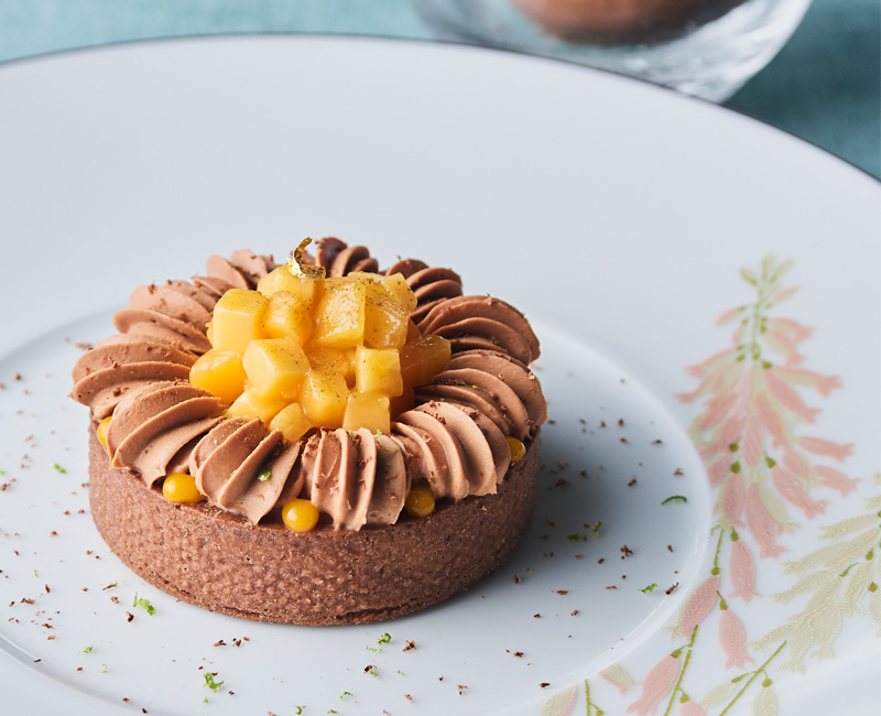 爽やかなマンゴーのコンフィやザクザクの芳ばしいプラリネ・フィヤンティーヌなどを重ね、ジューシーなマンゴーとシャンティショコラを飾ったタルト。スモーキーなジャワ産カカオのアイスとともに。