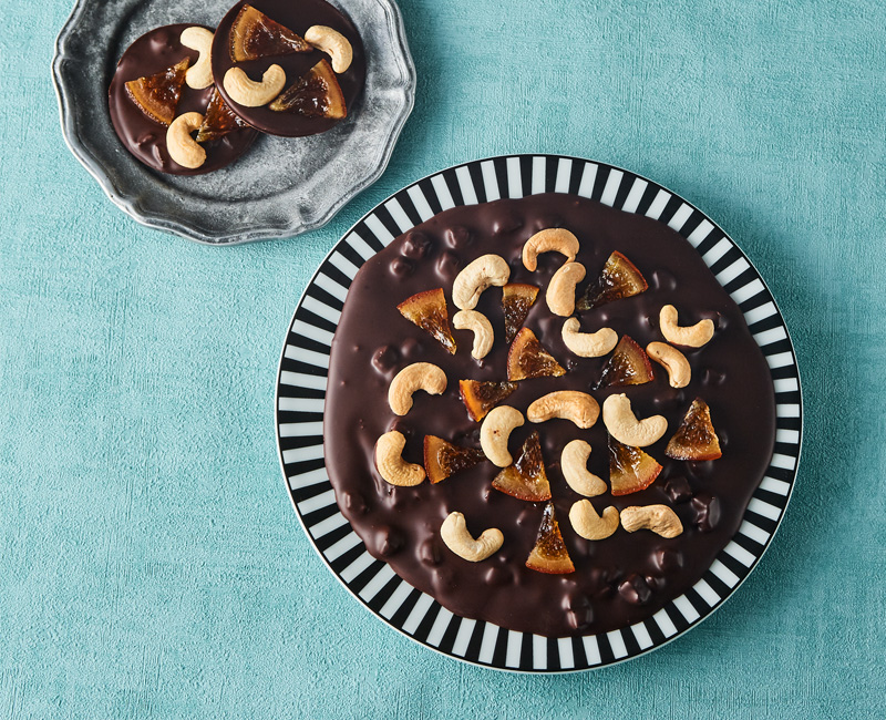 今夏おすすめの「ラウンドショコラ」はドミニカ産カカオとオレンジの香りが爽やかな「オレンジカシューナッツ」。直径約20cmの「大」は箱入り、直径約6cmの「小」は個包装です。