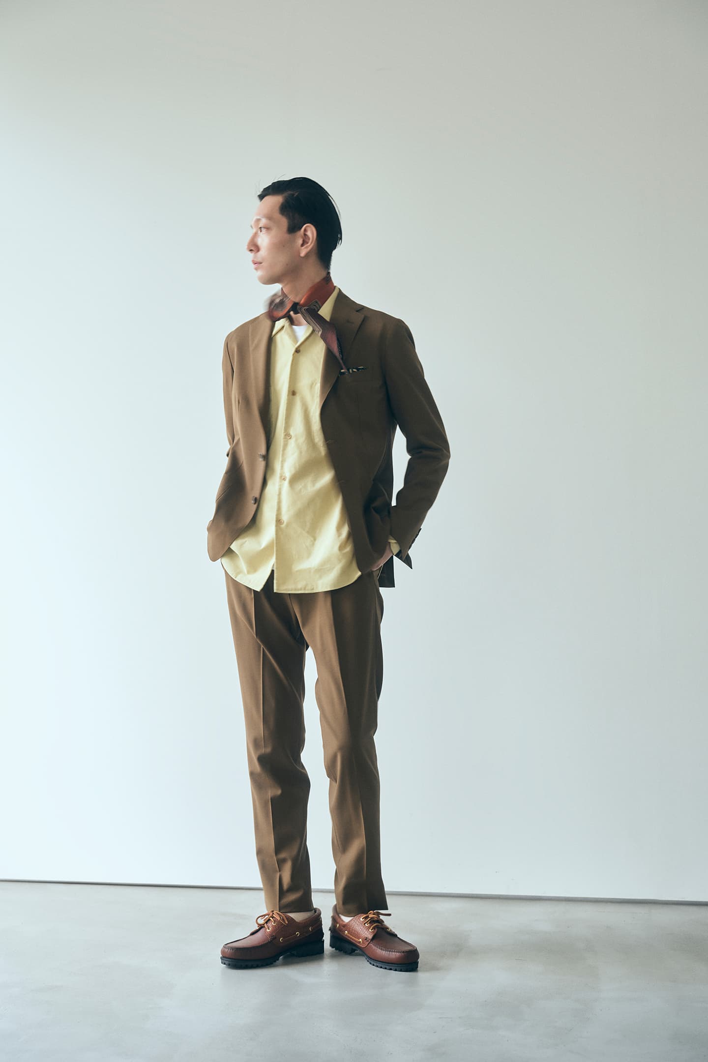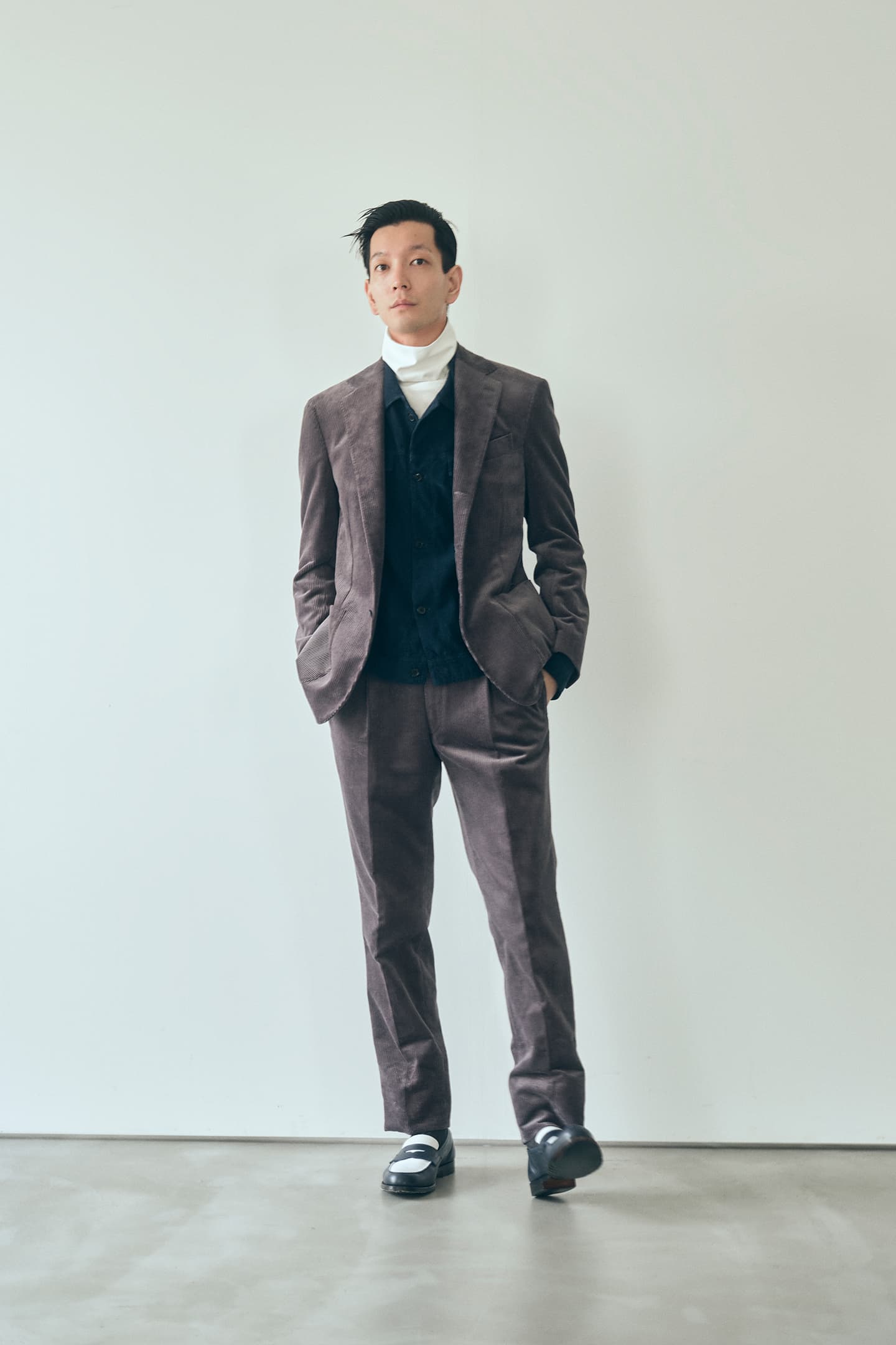 - 三田(以下M):年々シルエットがタイトになっている傾向があります。一方で、コロナによってスーツを着る場が減ったので、柔らかい素材を使っていたり、ウエストがゴムになっていたりと、動きやすさを重視した作りのカジュアルスーツの需要も多く、様々なブランドから多くリリースされています。コーデュロイなどありそうでなかったセットアップも多いですね。“細さ”と“動きやすさ”が今のスーツのキーワードだと思います。