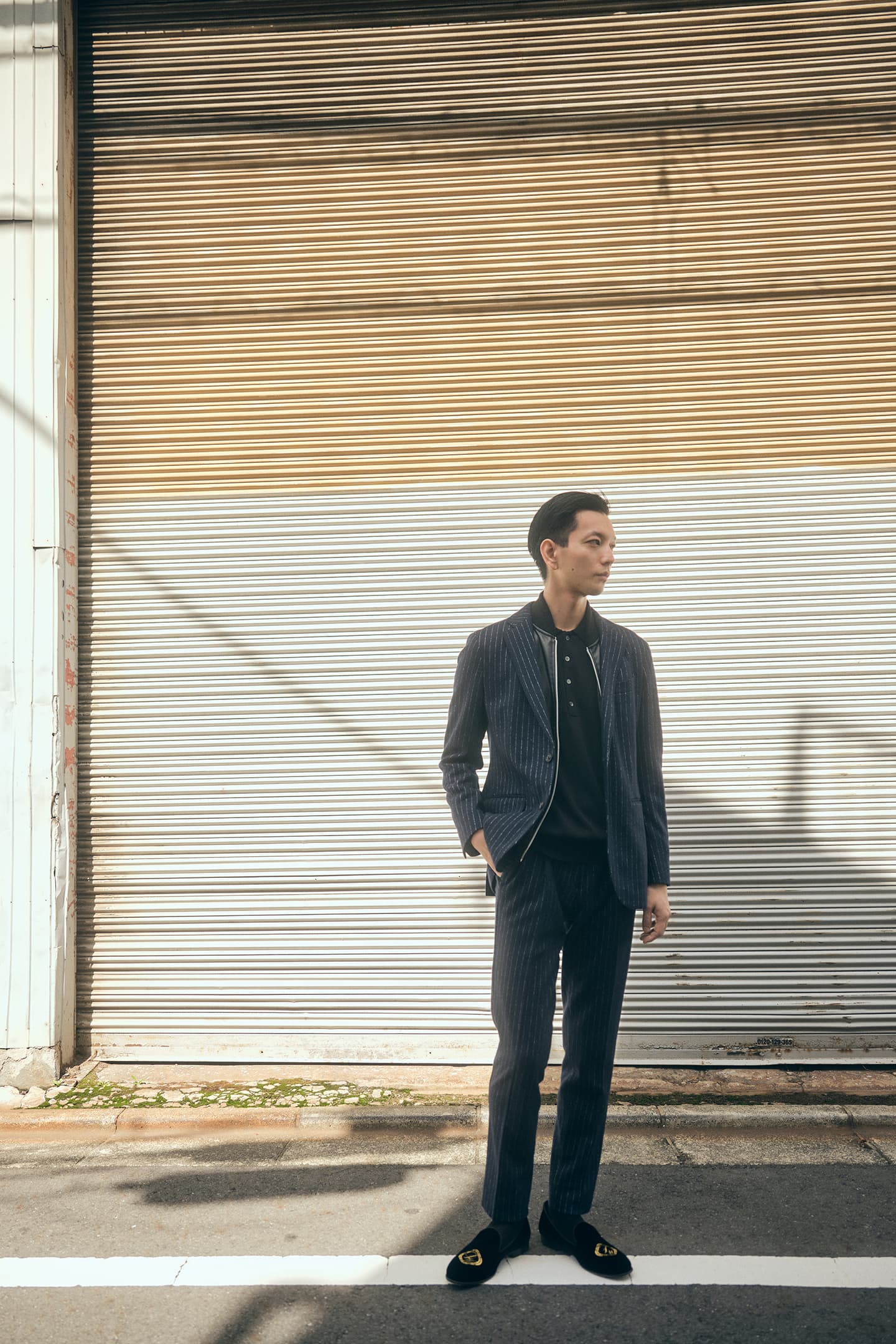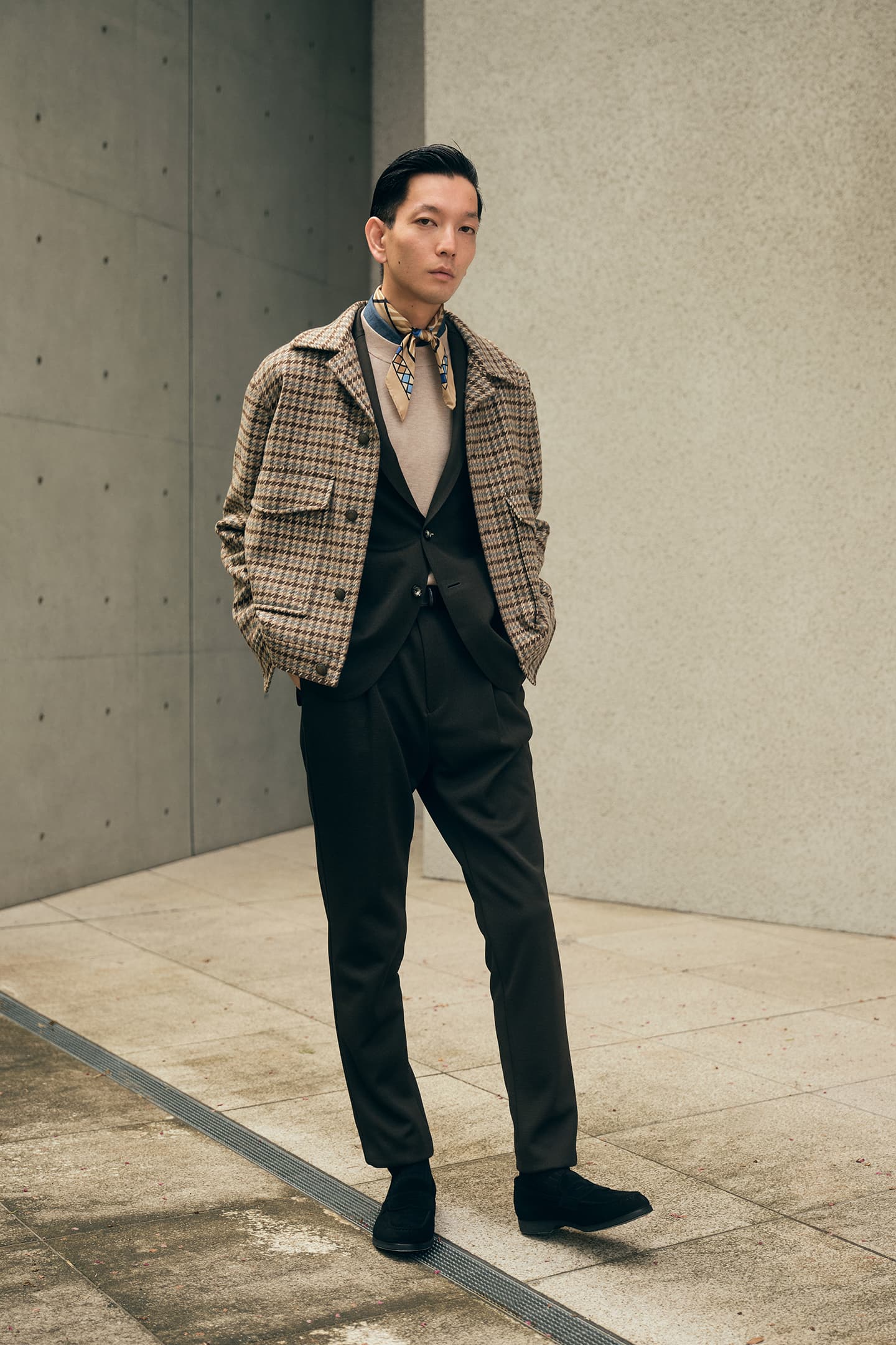 - M : “スーツをどう崩すか”が今回のテーマだと考えていたので、あえてネクタイを入れないようにした上で、カジュアルにしながらもスーツのフォーマルさを出すことにこだわりました。合わせるアイテムを足し引きすることで、オンにもオフにも着回せるバリエーションが生まれるスタイリングを目指しました。まずはカジュアルから入って、スーツの楽しさにハマってほしい。もっとブルゾンを着る感覚でスーツを着てほしいんですよね。六本木ヒルズにはそれを叶えてくれるアイテムが多いです。
