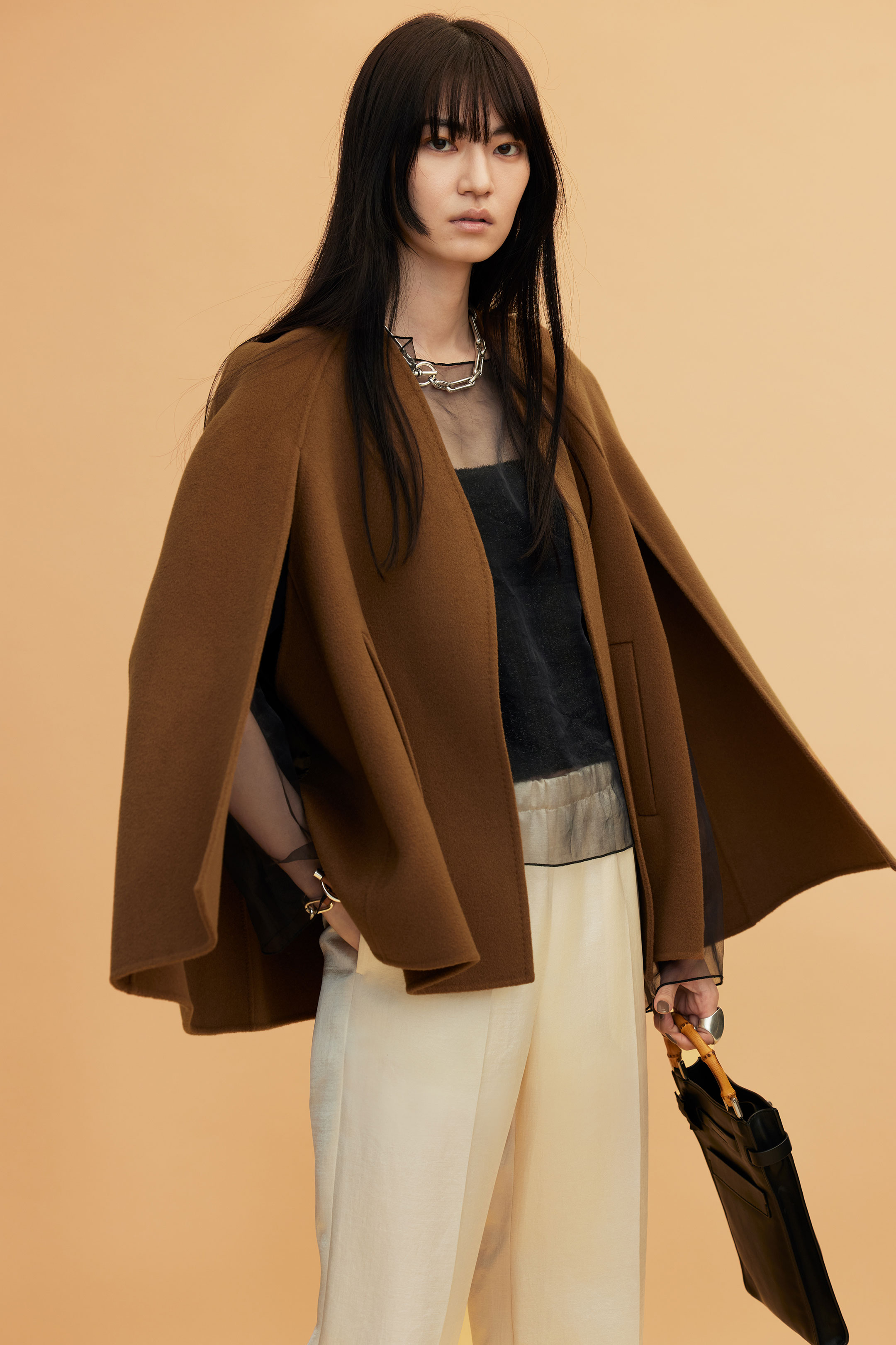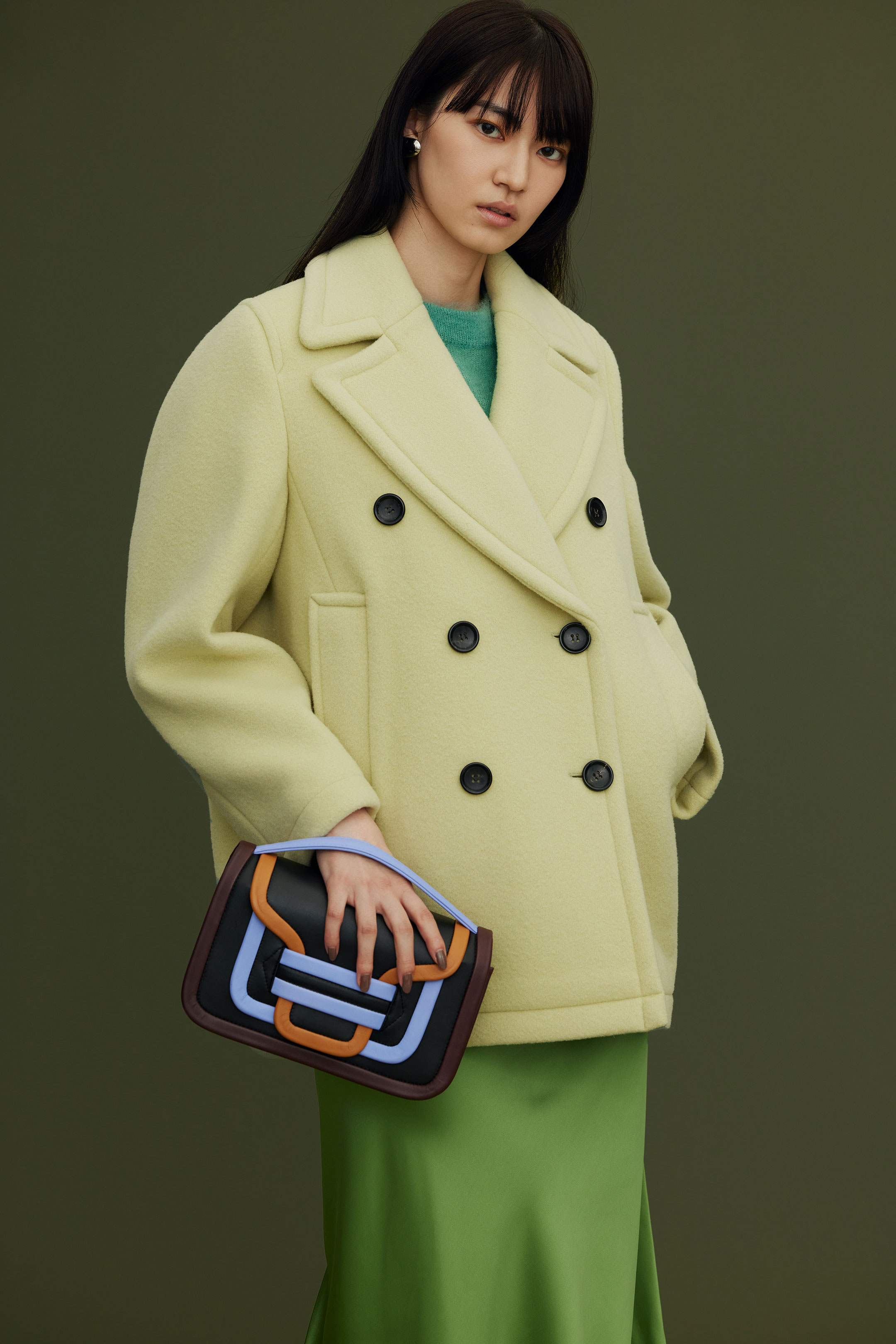 - 風間 ゆみえ(以下K):そうですね。高級感あるロングコート、カラフルなPコート、マスキュリンなビッグシルエットのジャケットに上品なケープとそれぞれのカラーが出せましたね。気持ちが華やかになり、お買い物に出かけたくなるような、ワクワク感、高揚感のあるスタイリングを目指しました。