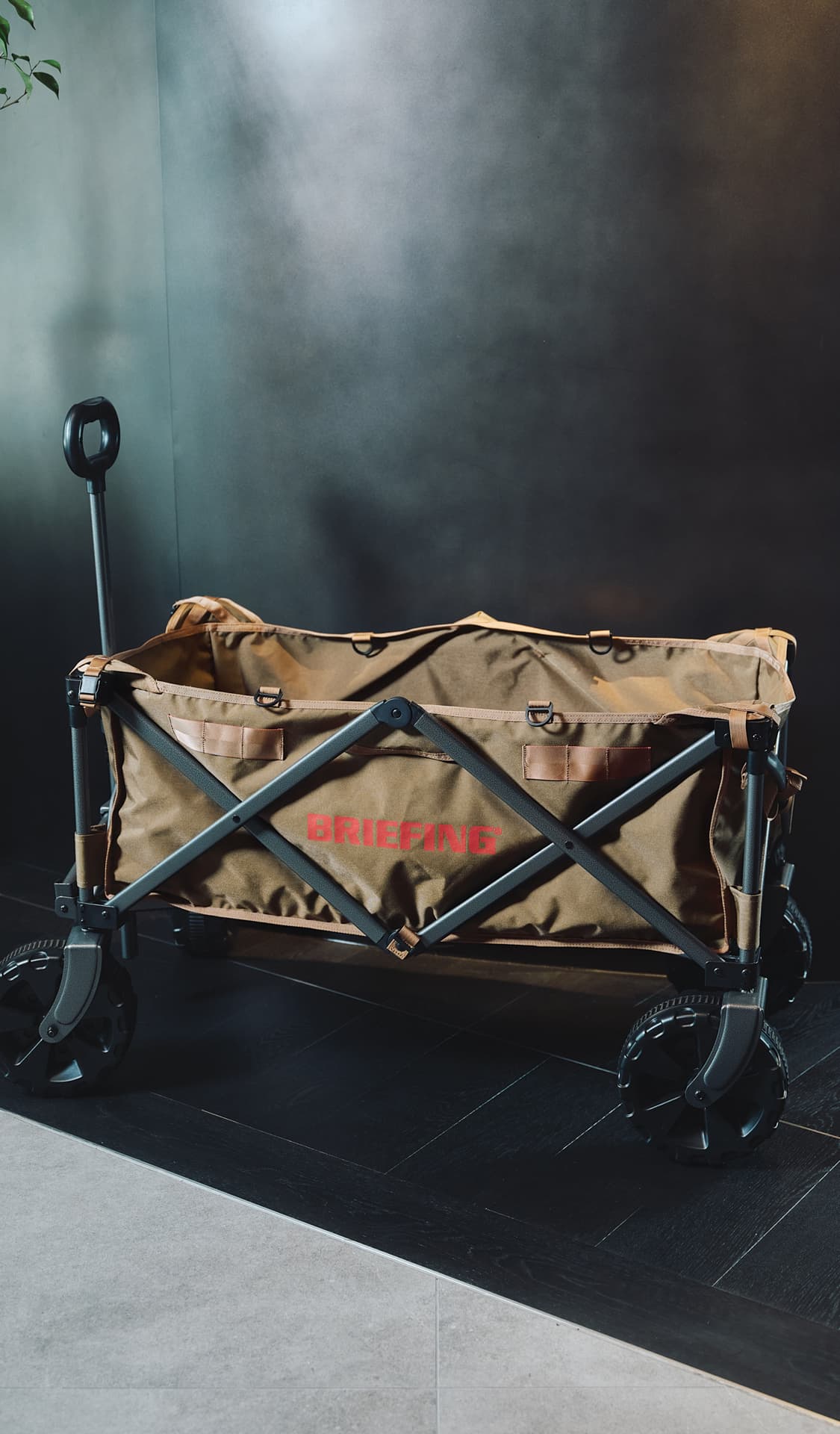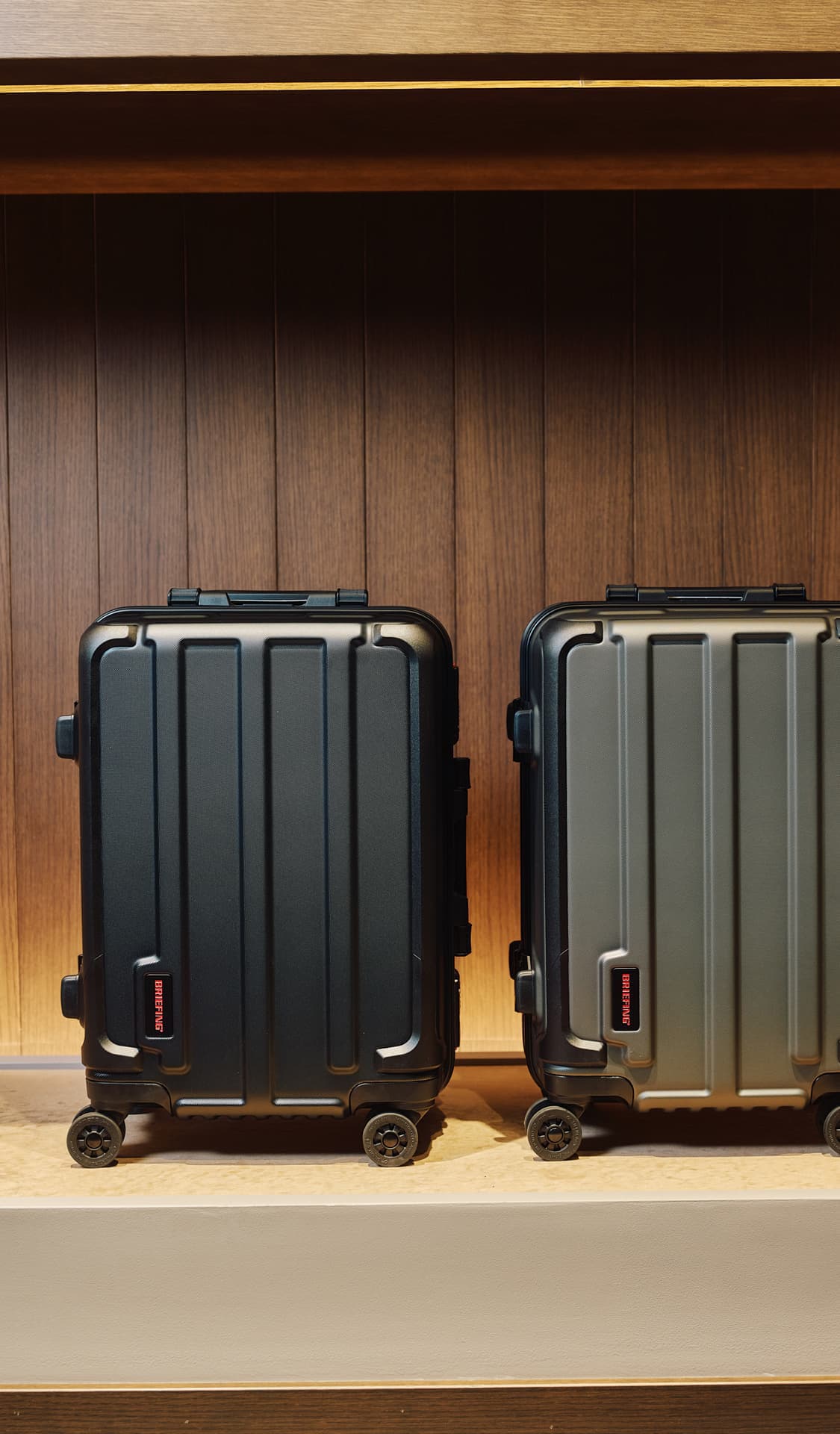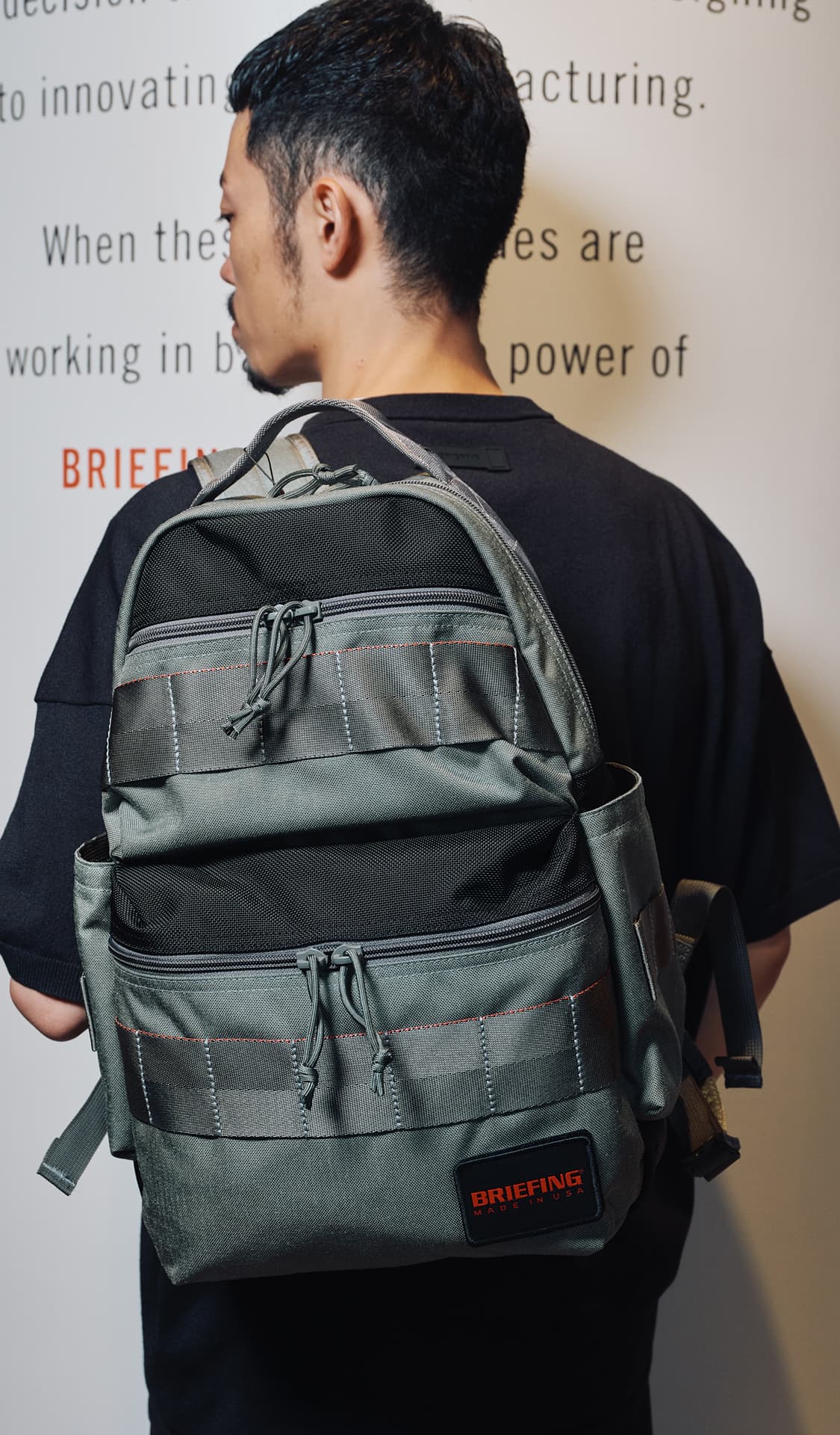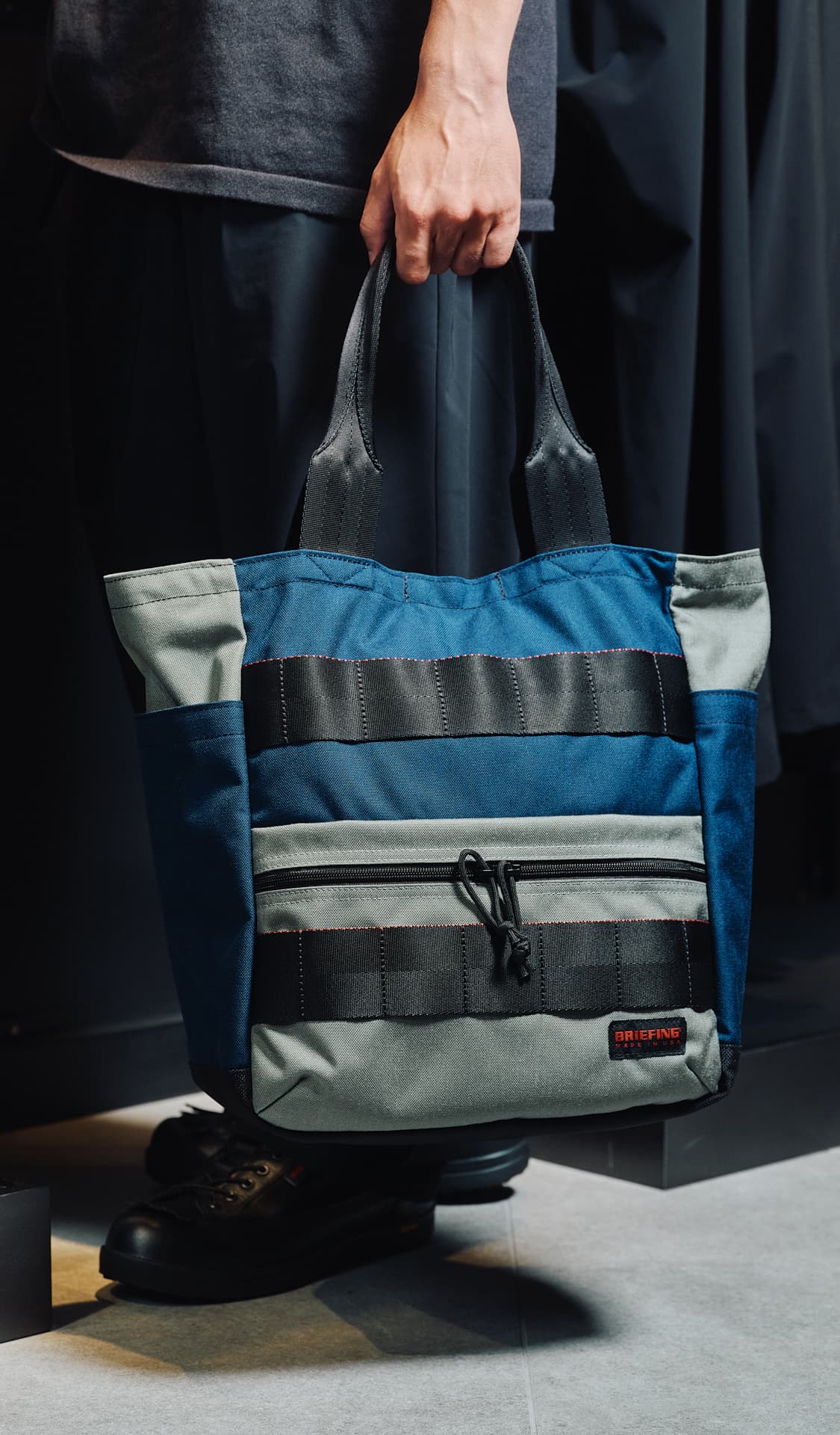 - 六本木ヒルズのシンボルである蜘蛛のオブジェ、“ママン”をくぐり、けやき坂方向へ歩を進めると、左側に見えてくるのがブリーフィング六本木ヒルズ店。去る5月にウェストウォーク4Fより移転・リニューアルオープンを果たし、これまでの1フロアから、2F/3Fの2フロアへと生まれ変わったこのショップ。数ある国内直営店の中でも最大の売り場面積を誇る広い店内で、2Fではバッグ、トラベル、メイドインUSA、アウトドア、レディースの各ラインが、3Fではゴルフラインが展開され、ブリーフィングが手がけるアイテムのフルラインナップを一度にチェックすることができるようになりました。また、正面に展示された巨大なニューヨークのランドスケープや、ブリックを使用したインダストリアルなデザインなど、アメリカをベースにしたブランドの世界観を存分に表現した内装もポイント。黒を基調としたモダンな什器に加えて、随所のネオンサインが、華やかでラグジュアリーなムードを演出します。