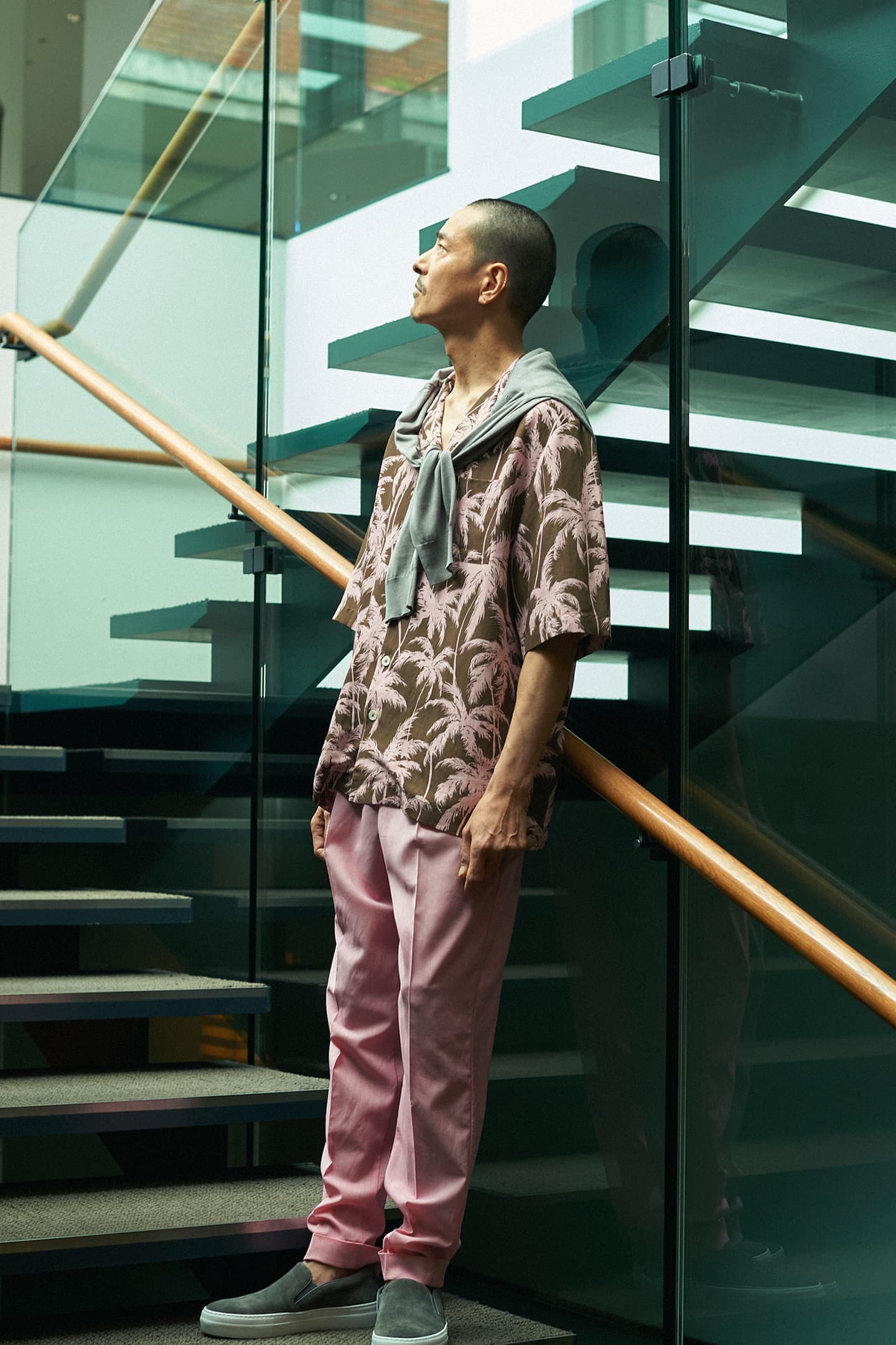 - 熊谷 隆志(以下K):やっぱり少し暑苦しくなりがちなので、柄 on 柄はできるだけ避けることですね。“トップスが柄ならボトムスはシンプルに、ボトムスが柄ならトップスはシンプルに”というのがセオリーです。若く見えがちな柄もシンプルなアイテムを合わせれば、大人の雰囲気を出せると思います。上質なアクセサリーを1つつけるだけでも凄く変わりますよ。もちろんお洒落に自信がある人は、柄と柄をぶつけるのもありだと思います。